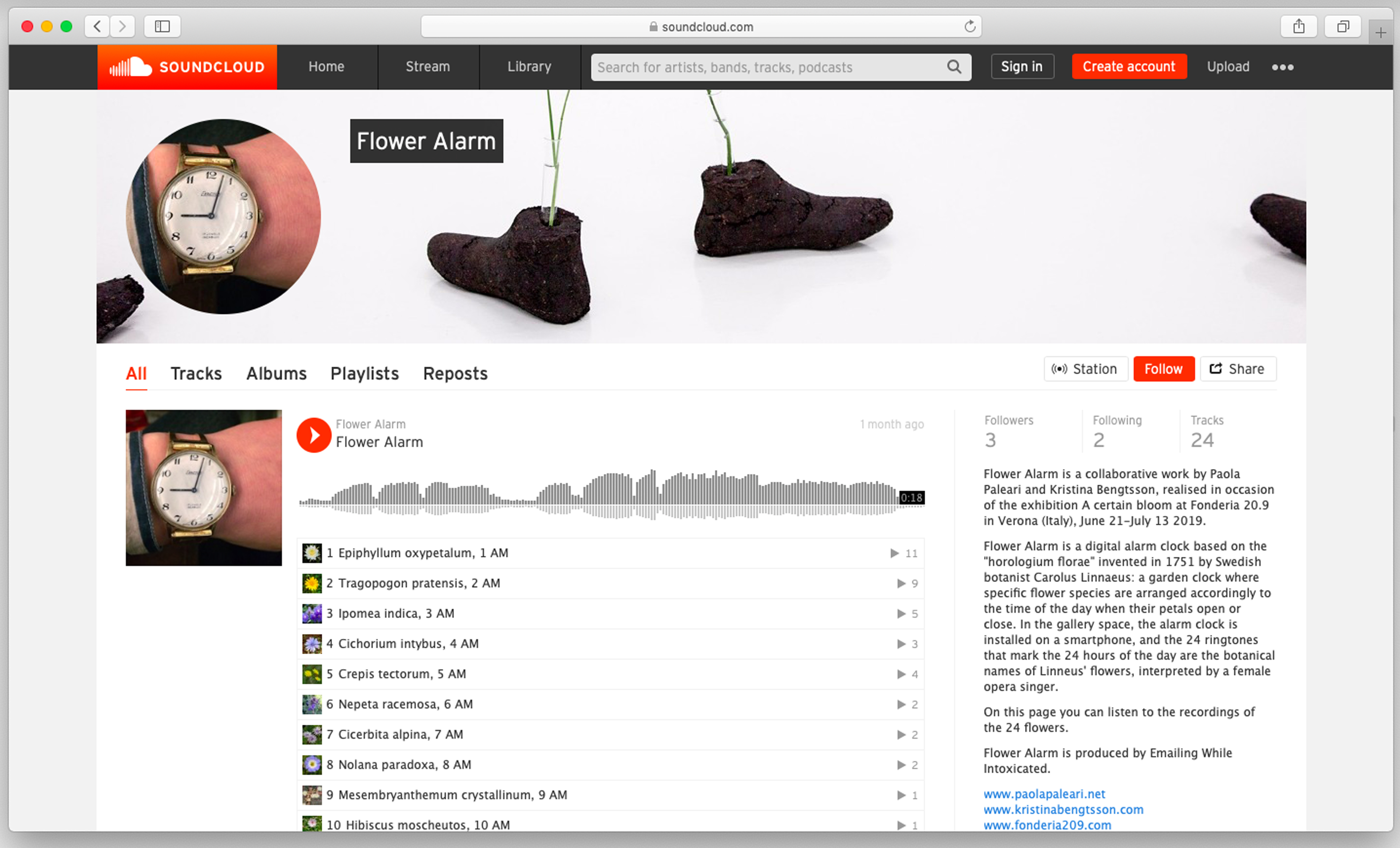 Flower Alarm, a collaborative work by Bengtsson and Paleari, further investigates the struggle between the rational management of nature and its concrete and sensual value. It is a digital alarm clock based on the horologium florae invented in 1751 by Swedish botanist Carolus Linnaeus: a garden clock where specific flower species are arranged accordingly to the time of the day when their petals open or close. The alarm clock is installed on a smartphone, and the 24 ringtones that mark the 24 hours of the day are the botanical names of Linneus’ flowers interpreted by a female opera singer.