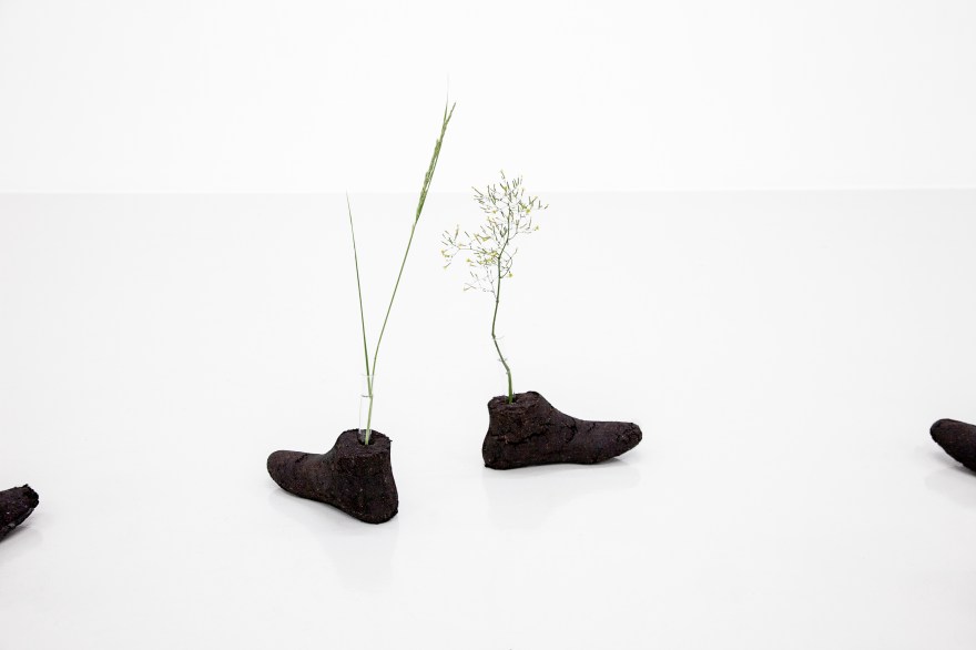In the series of sculptures that lends the title to the show, Bengtsson explores the residual space in between the pre-established rational categories we adopt to orientate ourselves in our daily lives. She does so by transforming a trivial shape – that of a rubber boot in two standard sizes, one female one male – into a poetic figure serving as a vase for a selection of plants, weeds and flowers growing spontaneously in the urban space. “A rose by any other name would smell as sweet”, Juliet says, implying that how we define things should not affect what they really are.