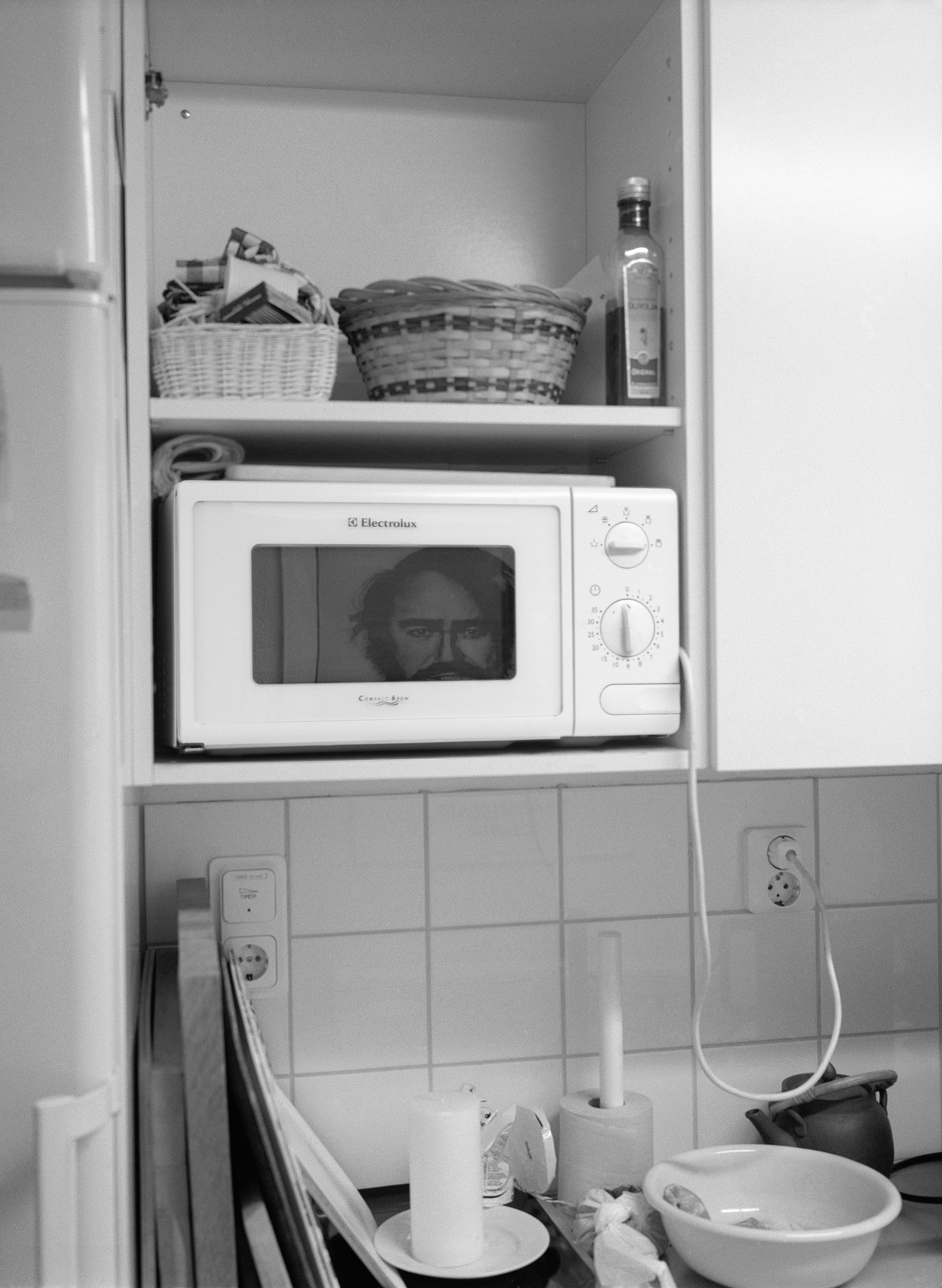 The image sets the tone for a reflection upon the clash between personal emotions and social constructions. Many of us might feel like we know Pavarotti to some extent, but what we are really confronted with is an iconography built around his powerful voice and charismatic persona. In an attempt to fill this gap, or in a comment on his partial representation as a human being, Bengtsson gives voice to a Pavarotti eternally trapped in the same spot in the series of writings Microwave Monologues.