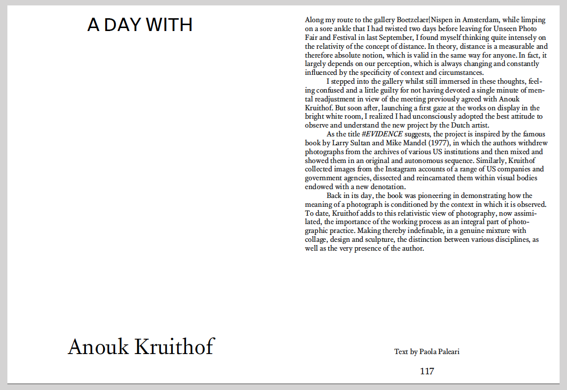 As the title #EVIDENCE suggests, the project is inspired by the famous book by Larry Sultan and Mike Mandel (1977), in which the authors withdrew photographs from the archives of various US institutions and then mixed and showed them in an original and autonomous sequence. Similarly, Kruithof collected images from the Instagram accounts of a range of US companies and government agencies, dissected and reincarnated them within visual bodies endowed with a new denotation.