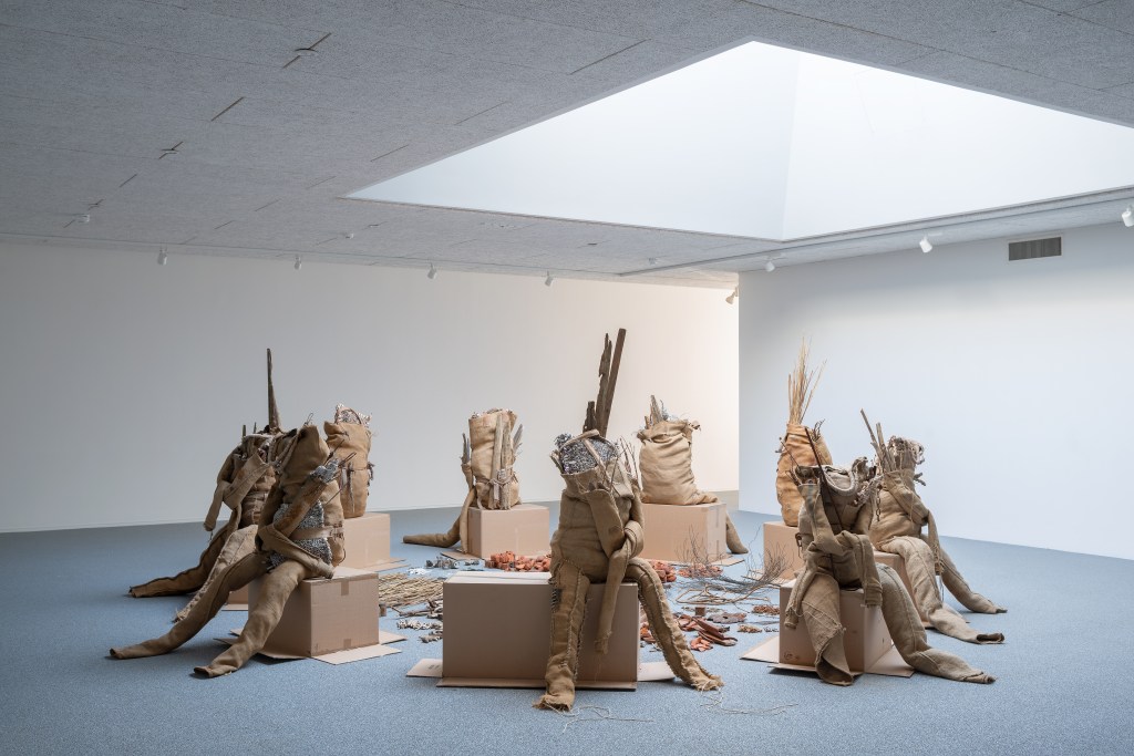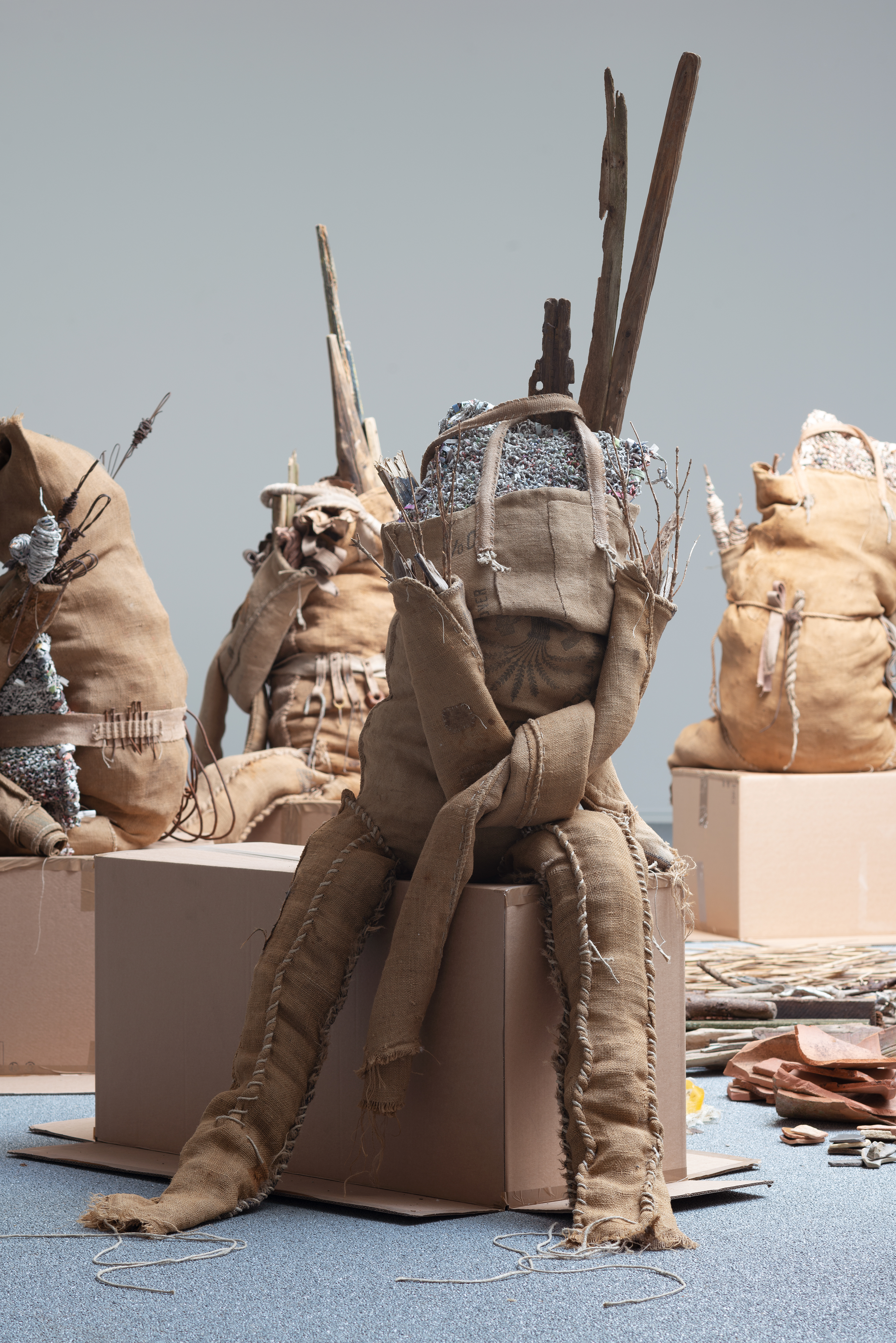 The figures are produced through craft techniques such as knitting, weaving and sewing, traditionally executed by women in a domestic context.