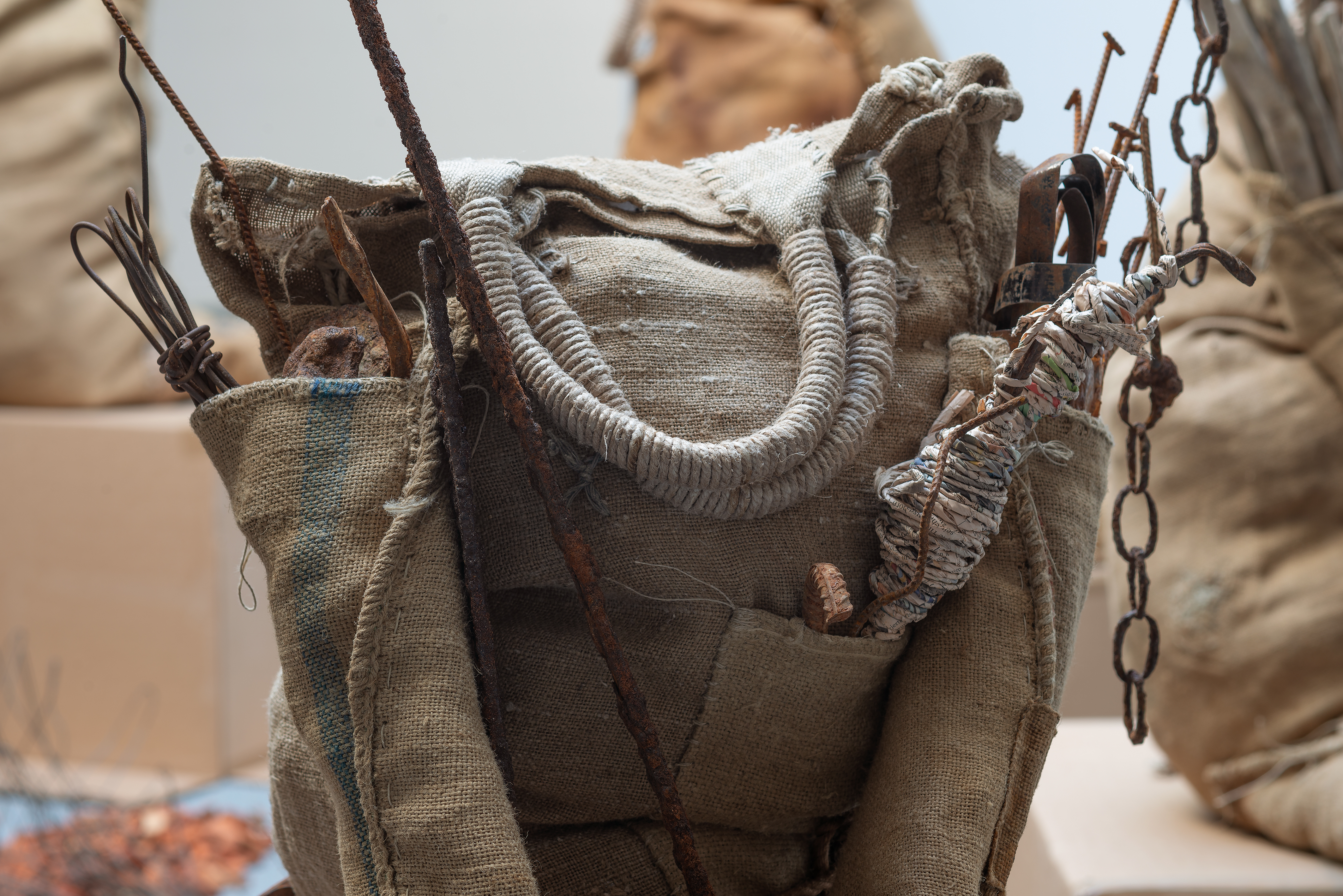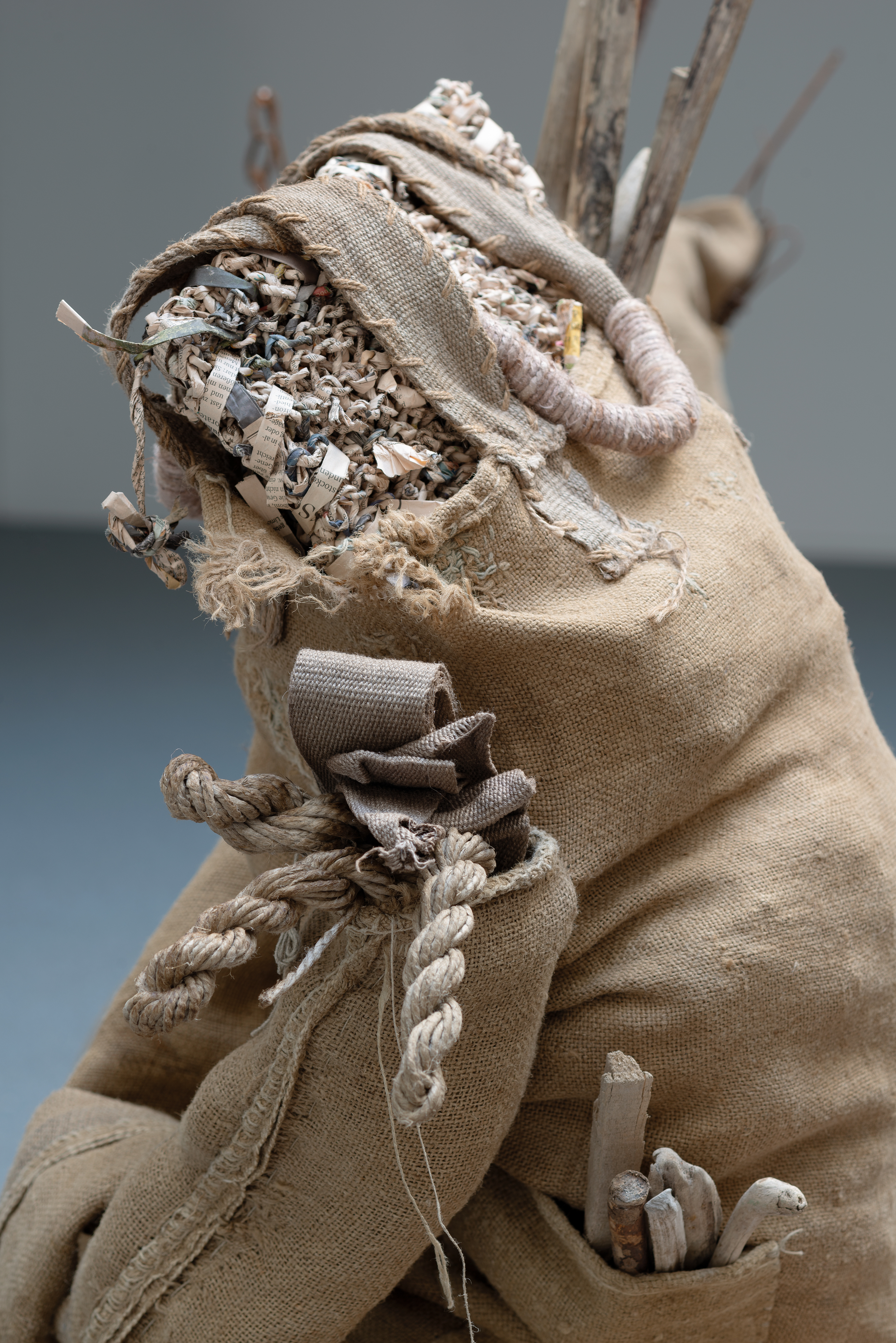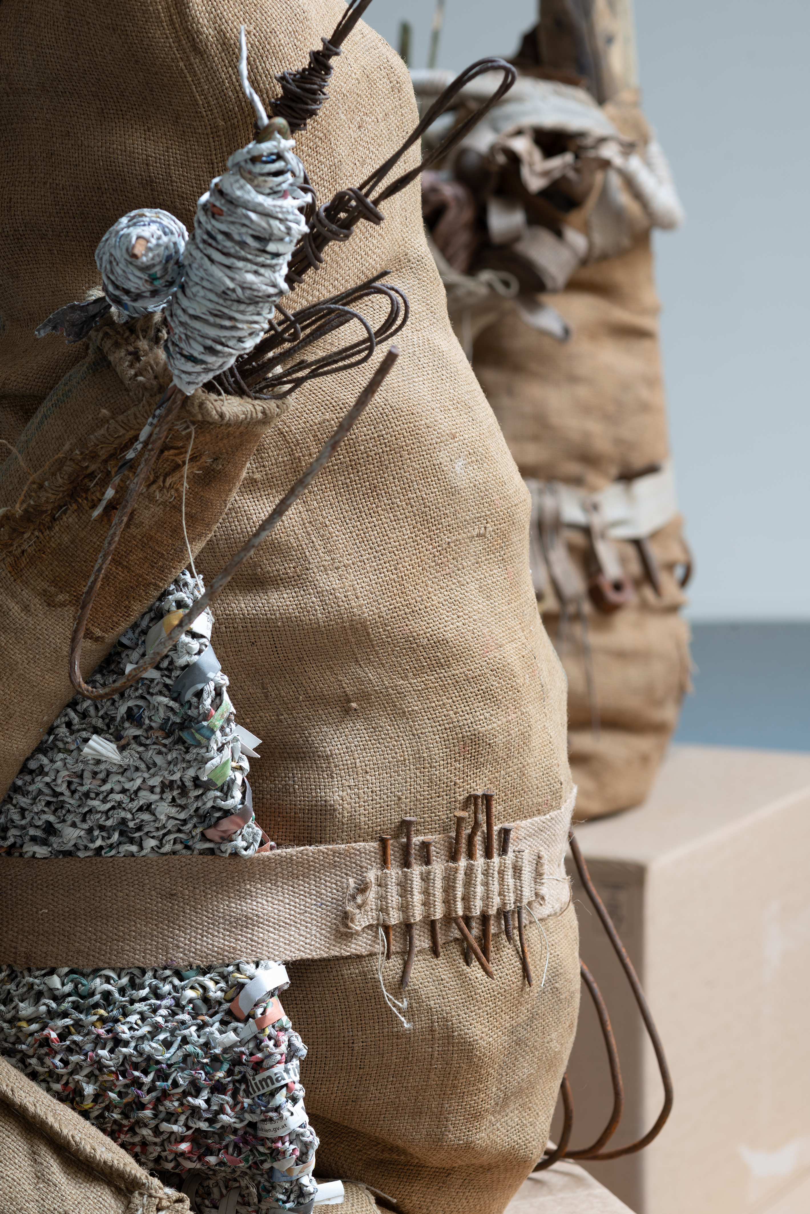 What characterizes Gorm’s choice of materials is their lack of current economic value. Some of them are materials from the past, such as the burlap sack, which today stands as a dusty symbol of trade and preservation in agriculture. Other materials are leftovers, including fabric remnants, metal found on the street, various elements collected in nature and recycled paper spun into yarn.