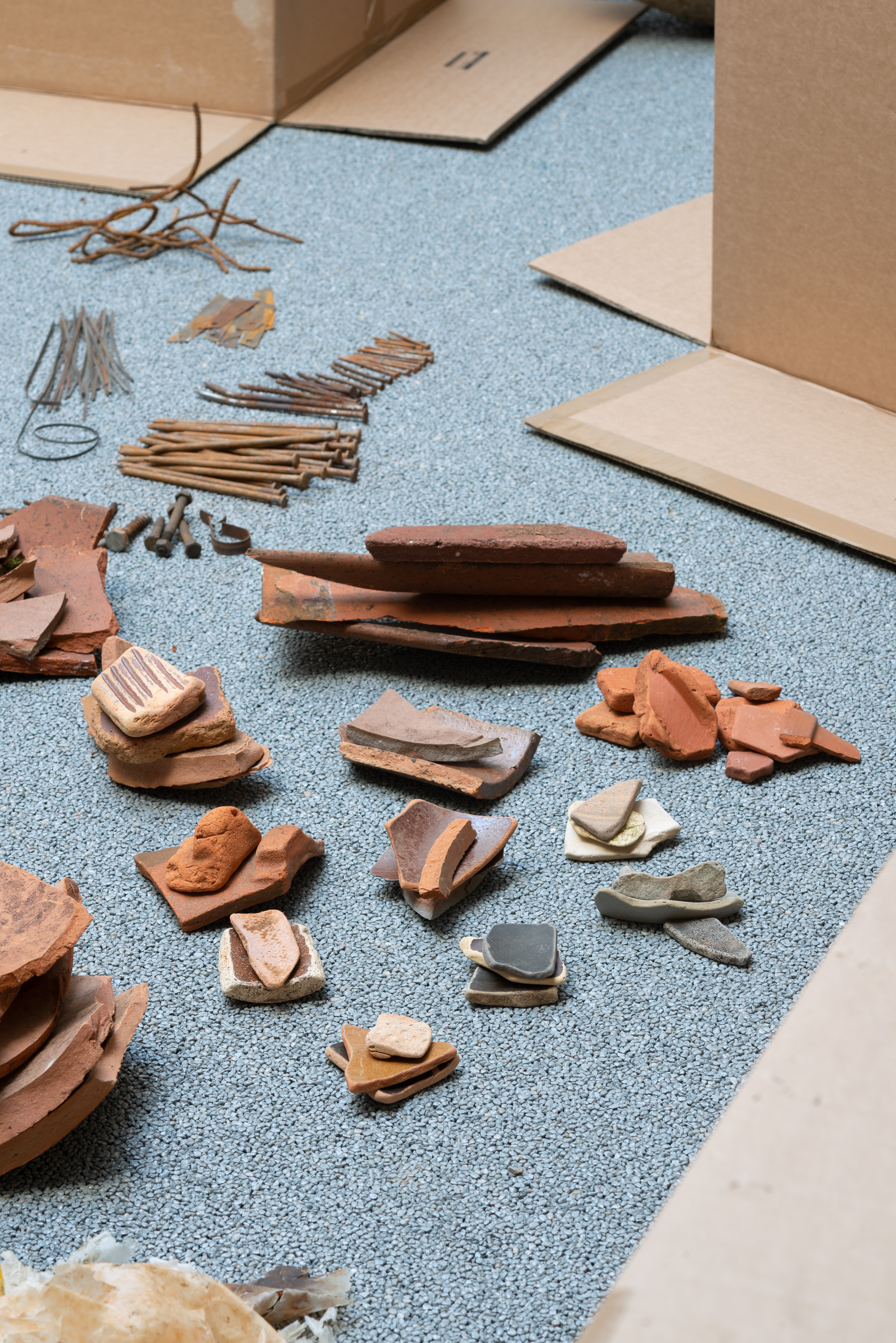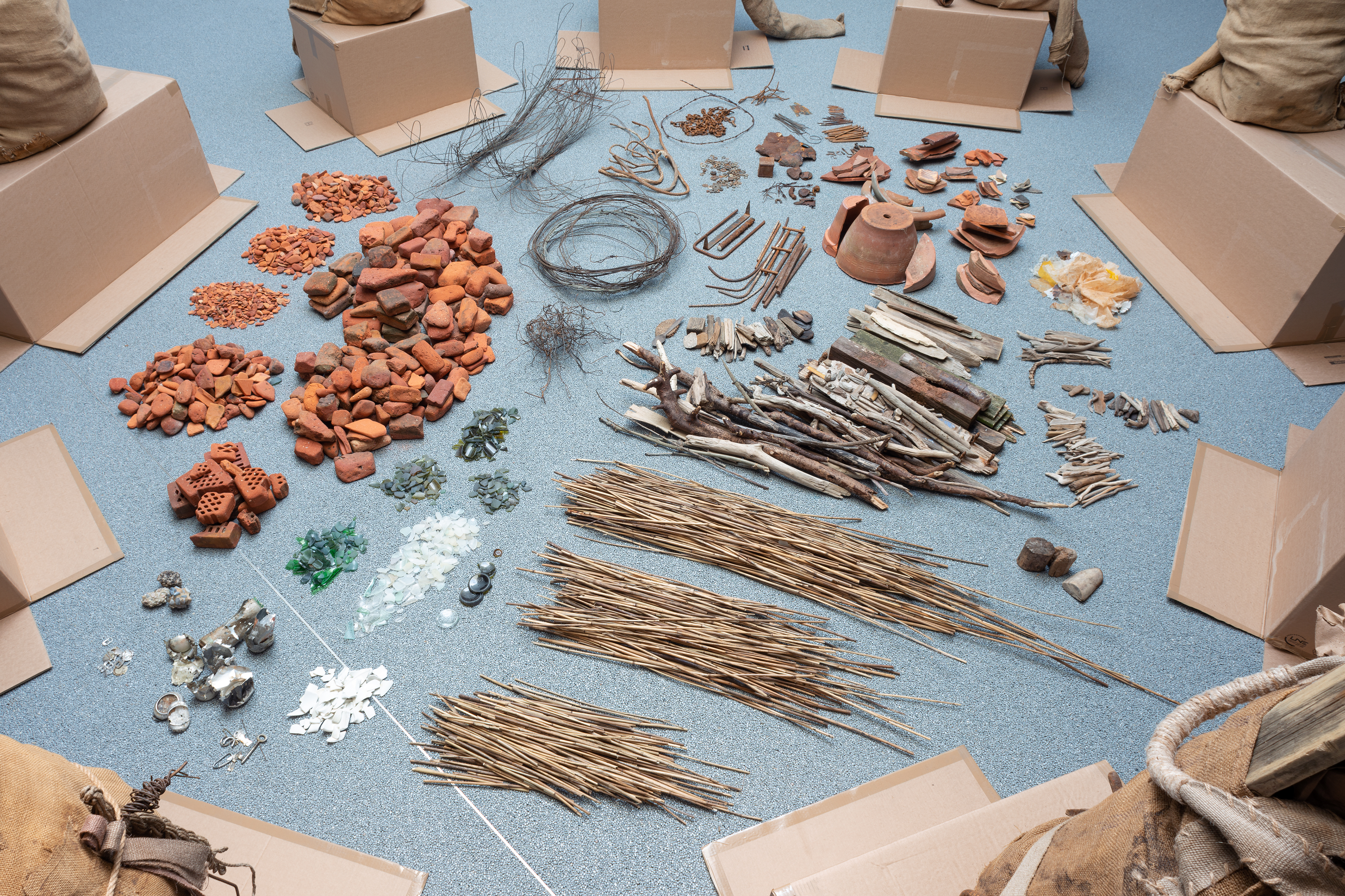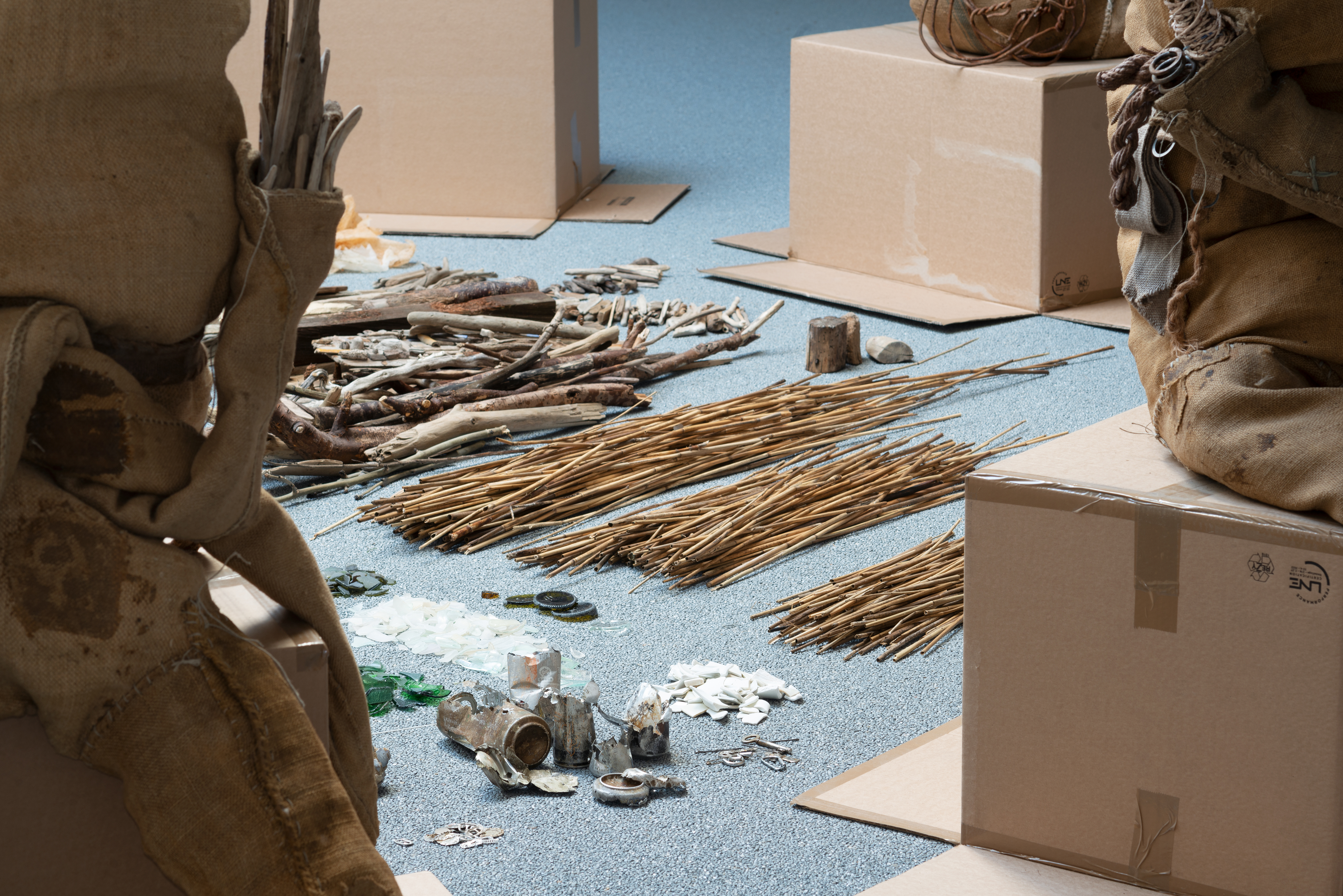 What characterizes Gorm’s choice of materials is their lack of current economic value. Some of them are materials from the past, such as the burlap sack, which today stands as a dusty symbol of trade and preservation in agriculture. Other materials are leftovers, including fabric remnants, metal found on the street, various elements collected in nature and recycled paper spun into yarn.