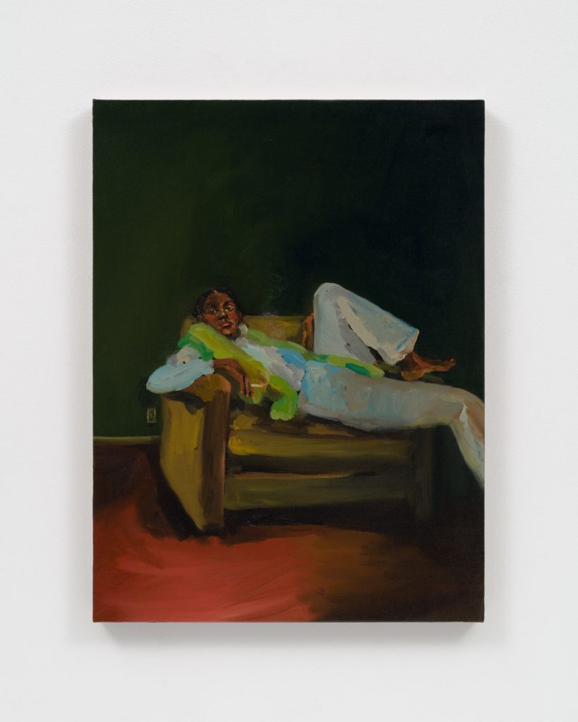 On the other hand, the photographic culture has become a significant infrastructure in the online negotium of 24/7 sharing and connection, and the screen is the vehicle enabling the performative selfhood of post-capitalism.4 In stark contrast to that, the women in Mckinney’s portraits are depicted in states of being that are irresolute, nonproductive, and unapologetic: a close-to-nothingness increasingly rare in our fast-paced society where even rest and self-care have been largely commodified. The quality of painting is most evident here, as the very same poses and situations, if photographed, would appear contrived or at least staged.