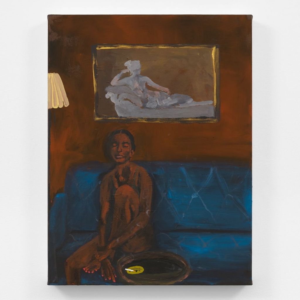 It is here—in the reclamation of her place in the universe—that the presence of a “metapainting” plays a crucial role. In Stay Put, a naked woman sits on a blue sofa with closed eyes and a lit cigarette resting in an ashtray. Above her head and slightly to the right, so it is perfectly central to the viewer, is a reproduction of the Neoclassical sculpture Paolina Borghese Bonaparte as Venus Victrix by Antonio Canova. The symmetry between the two women is almost absolute, as if they were complementary and, at the same time, opposing forces. Both bodies laze on pillowed couches and have a languid and voluptuous attitude that seems to be whispering Billie Holiday’s words: “Love me or leave me and let me be lonely”. Despite their distance in time and space, they are allies.
