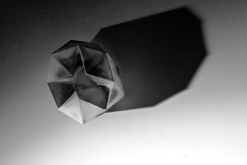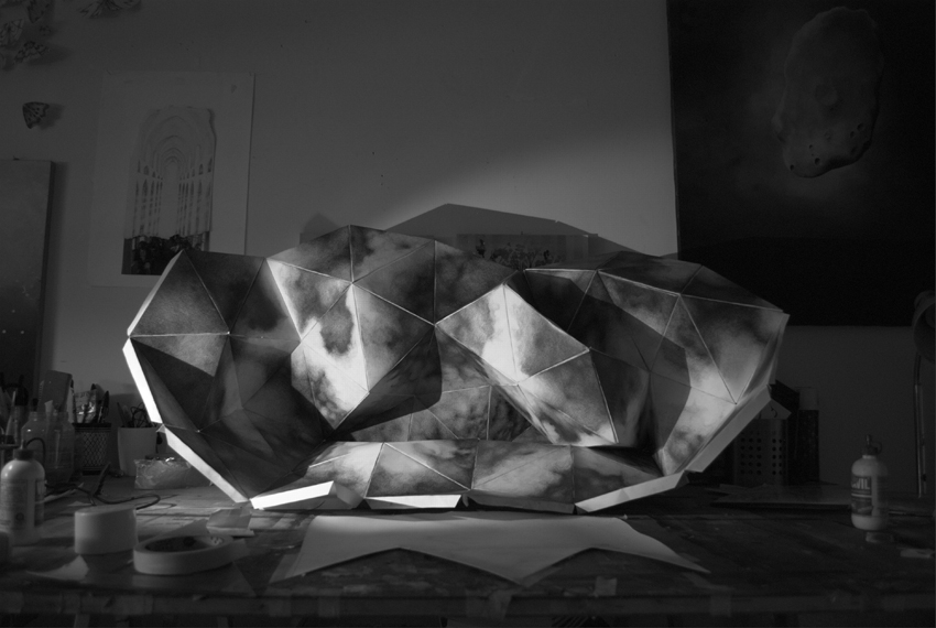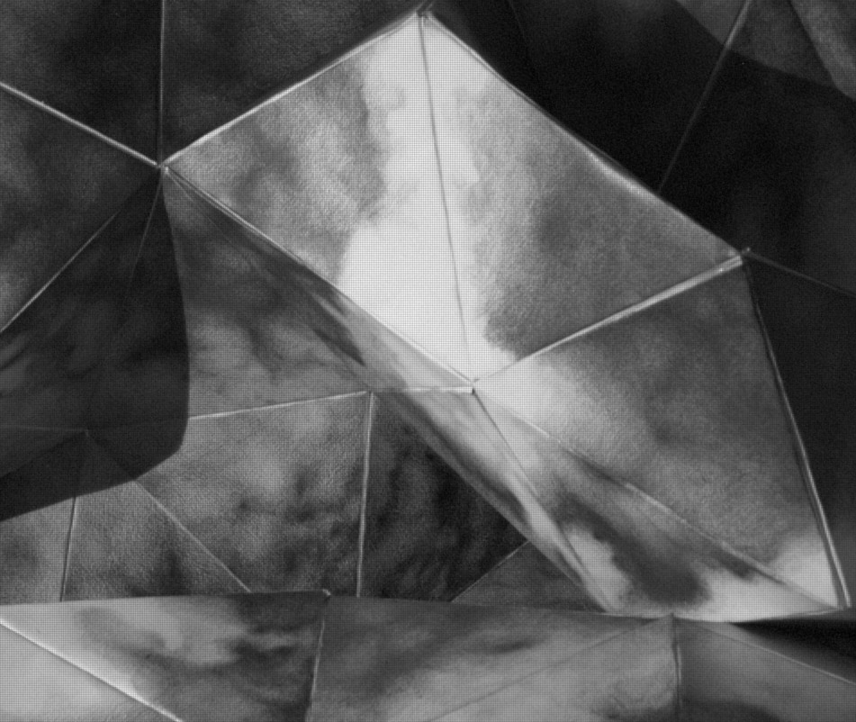 The series Exit explores the possibilities provided by the matching of a simple material such as drawing paper – a privileged support in Cicero’s artistic practice – and a pure geometric figure: the triangle. Through the repetition and the montage of a fixed triangle module, the artist creates articulate structures whose total balance is derived from the combination of the parts and whose spatial behaviour is regulated by physical laws. The sculptures thus carry a double value: on one hand, they are “automatic” products because of their geometric nature; on the other, they are potentially infinite objects. Cicero underlines this aspect by applying a monochromatic pencil and charcoal texture on the whole surface, as a cross reference to the cloudy atmosphere.