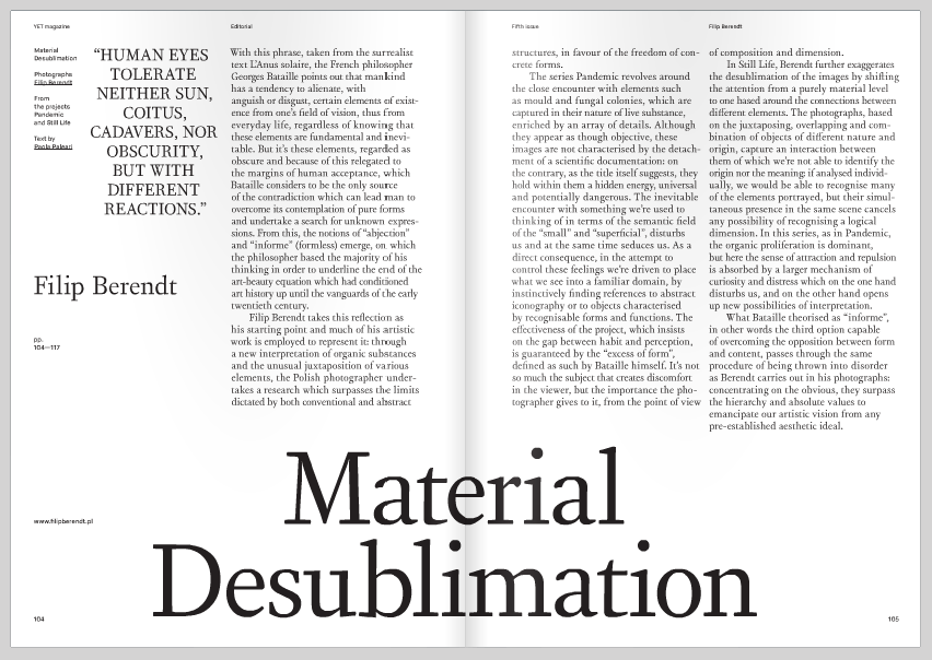 What Bataille theorised as “informe”, in other words the third option capable of overcoming the opposition between form and content, passes through the same procedure of being thrown into disorder which Berendt carries out in his photographs: concentrating on the obvious, they surpass the hierarchy and absolute values to emancipate our artistic vision from any pre-established aesthetic ideal.