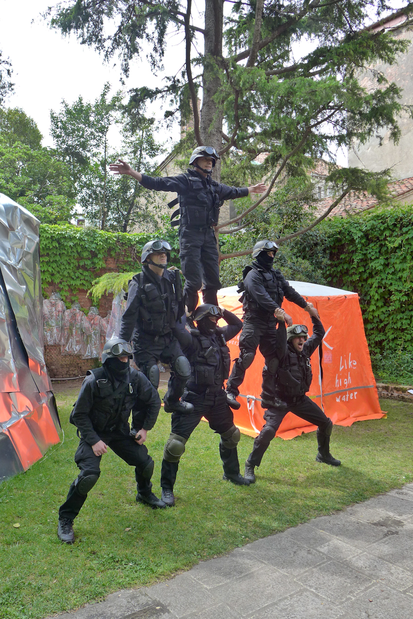 Artnoise was in Venice to follow the set-up of the work, whose aim is to test the audience’s response when this kind of “warlike arrangement” is brought into the peaceful first-world urban environment. The spectrum of reactions was predictably extensive and even included indifference when, for example, the performers mimicked basic surveillance actions such as walking around in pairs, as if it was normal to meet fully equipped soldiers within the hectic and hyper-crowded context of the Biennale’s opening. After all, to be observed equals to be safe.