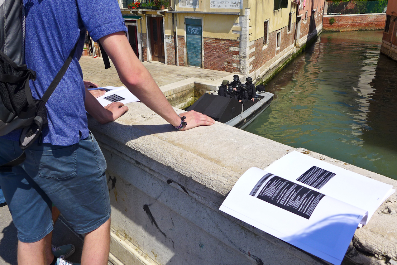 Though, things were turned on their head when the soldiers started to behave in ways they were not expected to, like bursting into a belly laugh for no apparent reason: the watchers suddenly became the watched and the whole moment moved onto the entertainment level, attracting crowds of curious onlookers and even whole press teams which, armed with all kinds of recording devices, put the troops under media assault. As a counterpart to the temporary subversion of roles, or better as a reminder of the existing hierarchy, the project included Black Flag: a publication made by artist Magnus Clausen listing citizens’ rights upon arrest in all of the ninety participating countries of the Biennale.