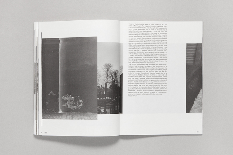 In agreement with the author, who does not feel his production strictly related to the book format and who thinks photography is a mutable and manifold matter, we publish a book free of the precepts that habitually regulate the flux of its content and the usual relations between the photographs and the pages. The volume’s content does not derive from a sequence of images designed according to aesthetic rules, based on formal and conceptual balance, but it has been obtained through a purely random process lacking of any type of selection refinement. All the photos in the book rigorously respect the numeric order of the photographic source – that is, the author’s archive made of thousands of images – and are presented consecutively respecting their original format regardless of the book’s page dimensions. At a later moment in the book’s design, the individual pages were randomly shuffled without caring about the page bleed or the overlapping between the photographs. The book that results from this process becomes a container that houses the images without any control over them, but granting them the uncommon freedom to create new ones.