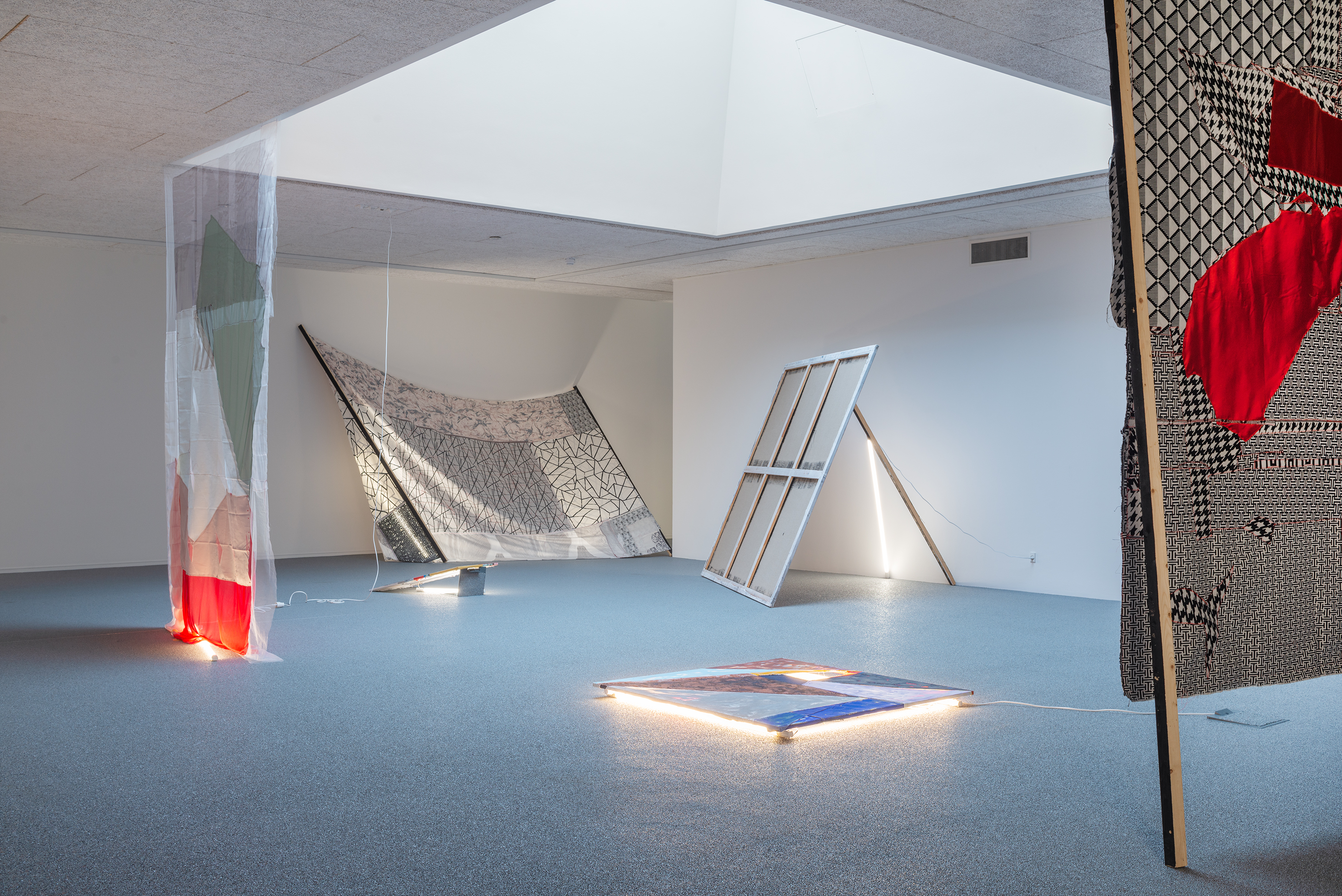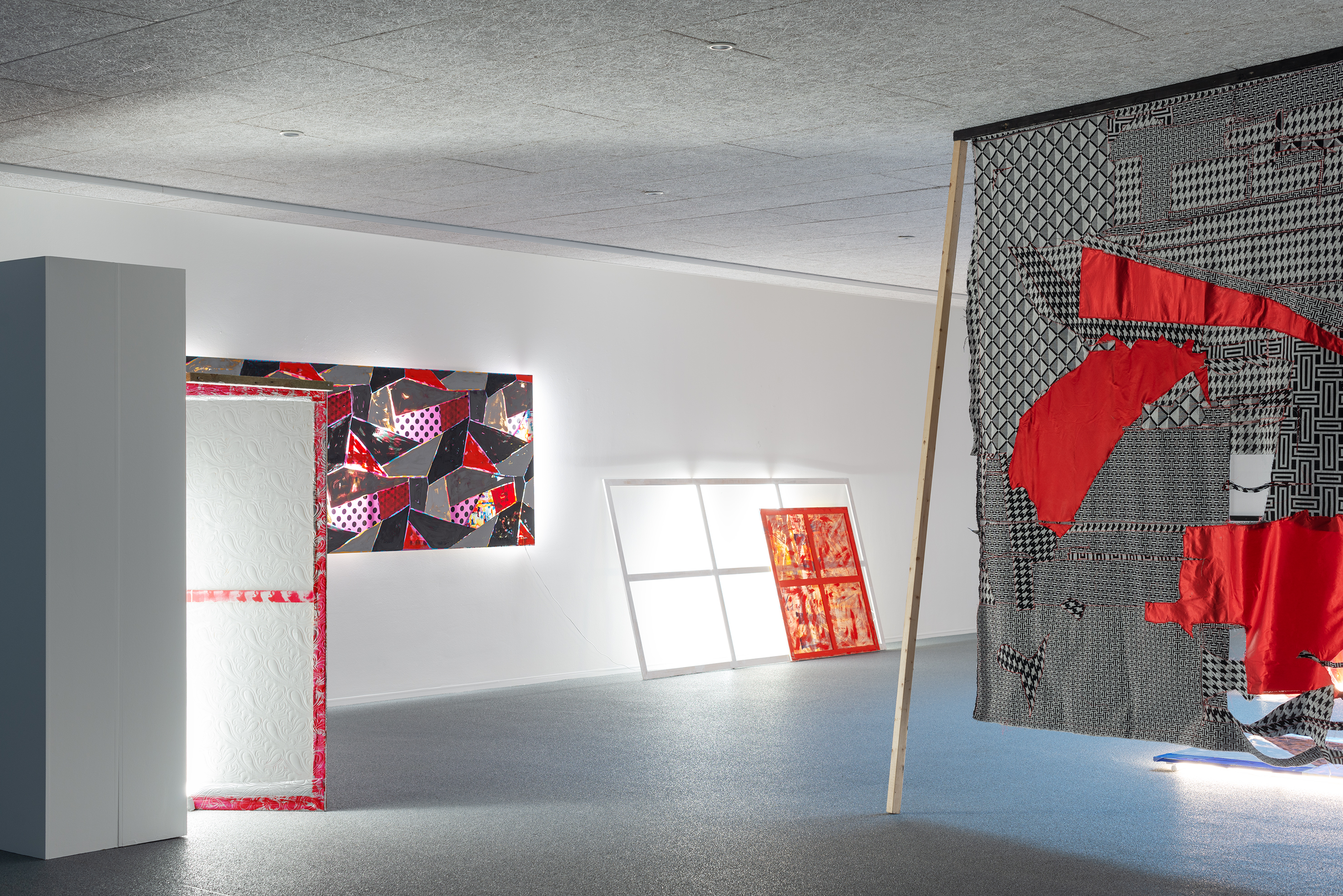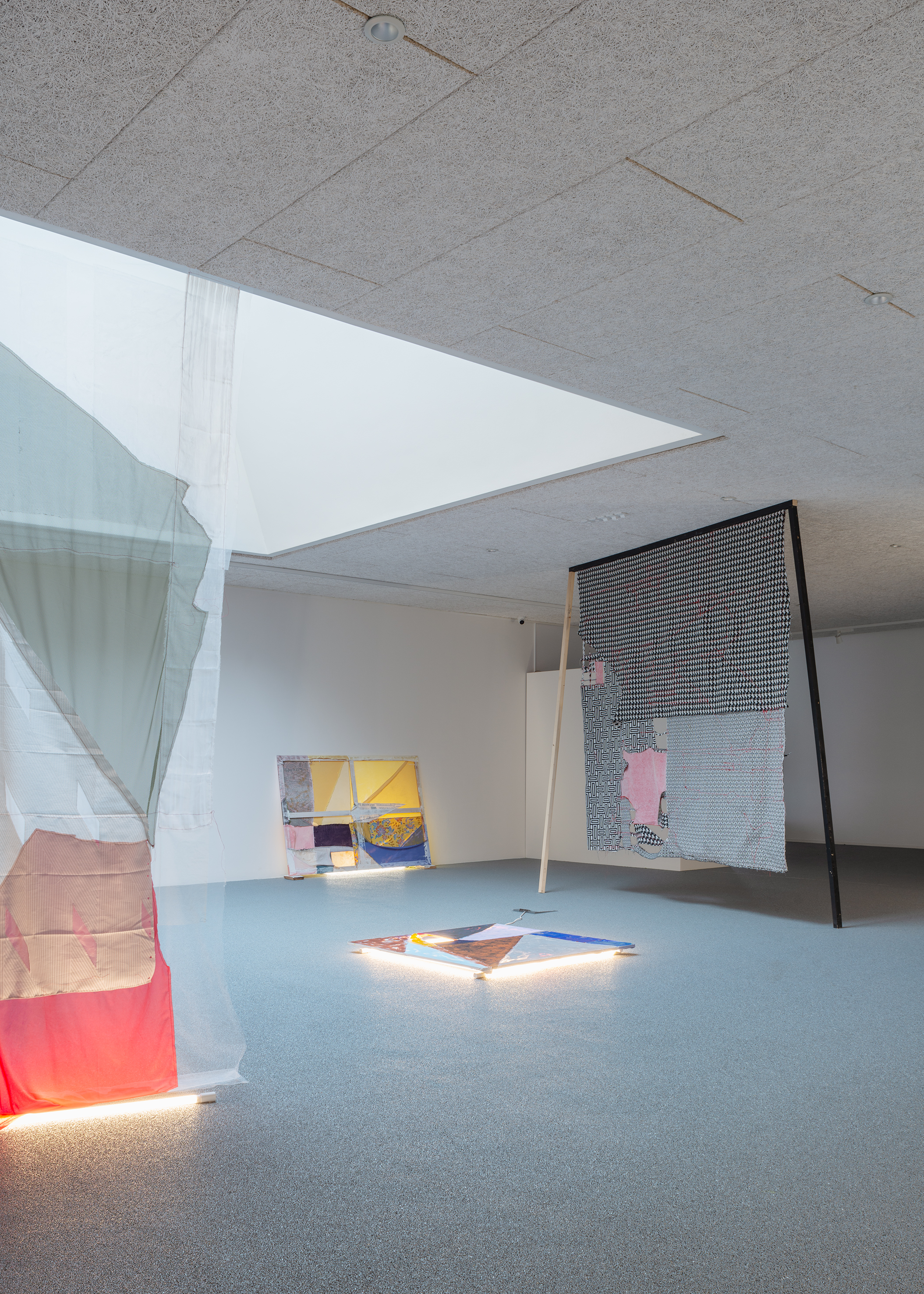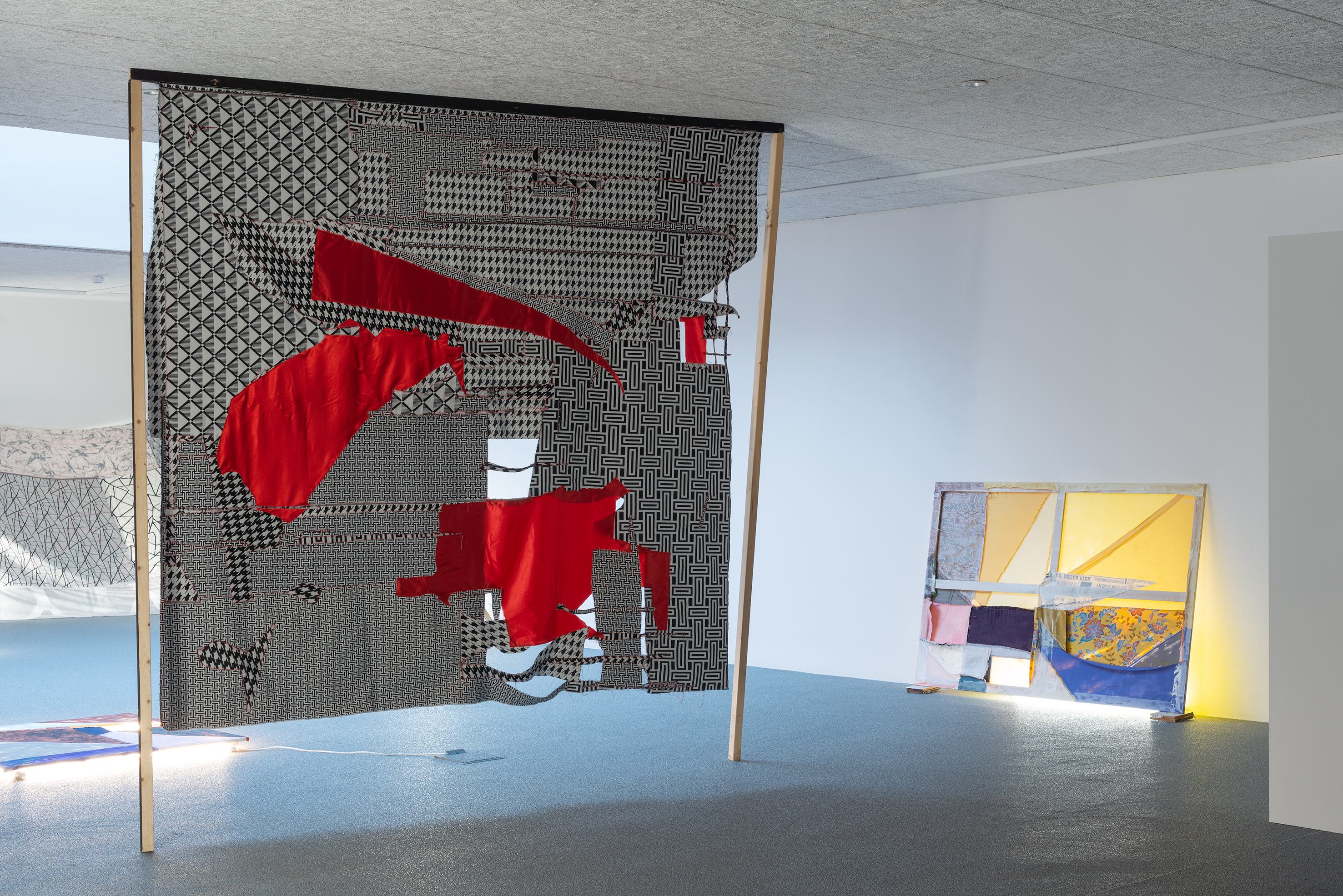 With this as a starting point, Winckelmann revisits pre-existing materials in an attempt to free them from their assigned identity and disturb the scope they were originally allocated to. A variety of leftovers from previous productions – such as building materials from the renovation of Dannerhuset in 2011, and textile cut-outs from older works – form the inventory at play here.