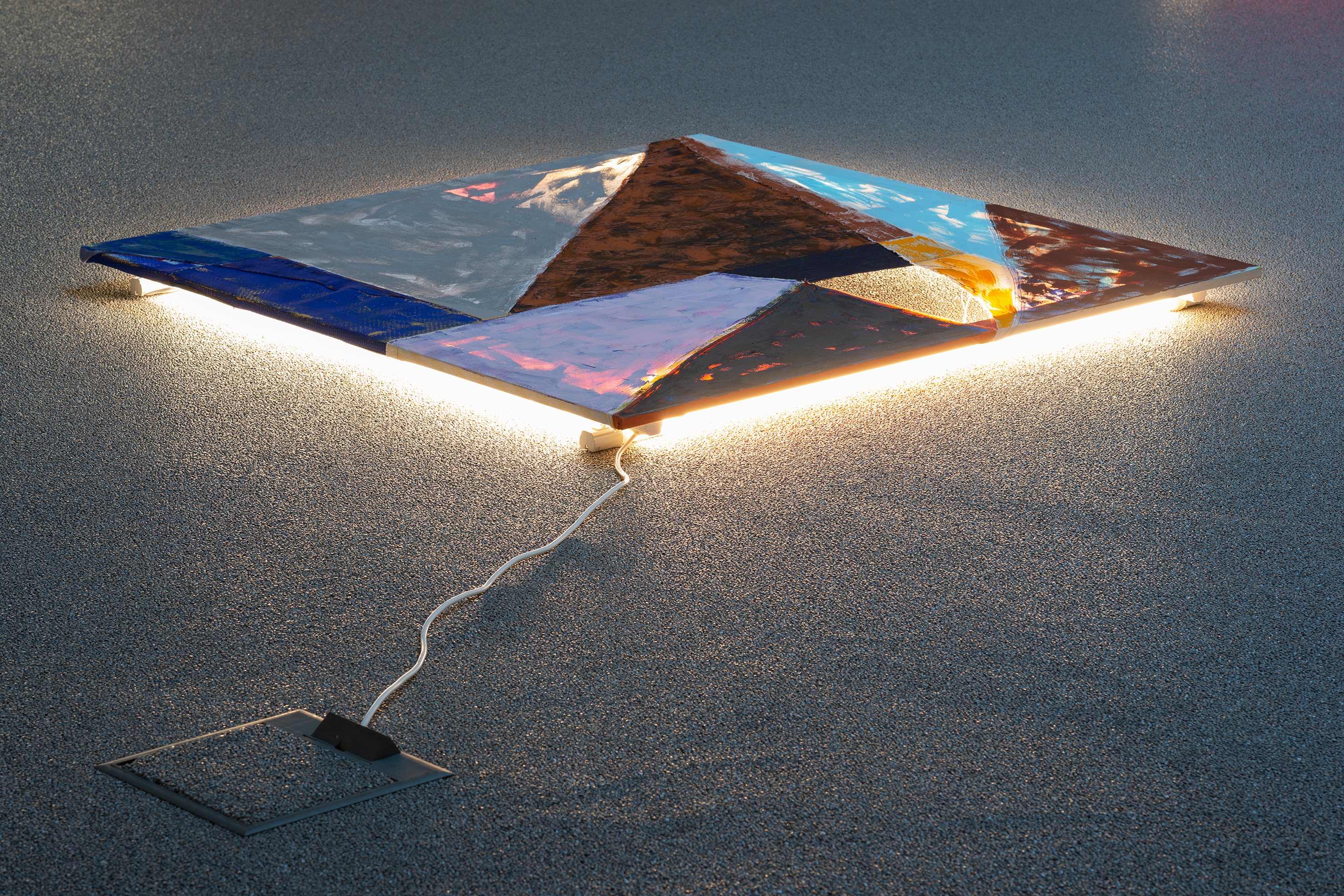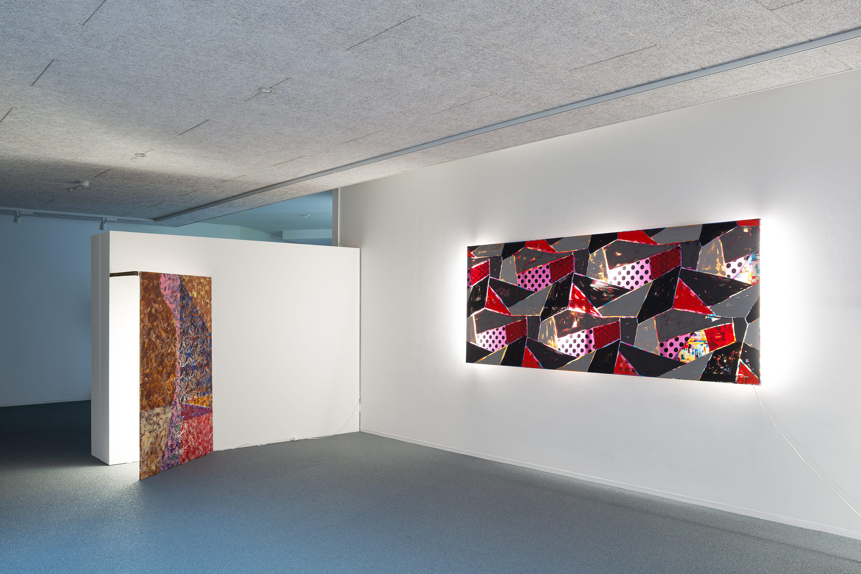 They are works that individually speak for themselves and insist on their own agendas. The use of fluorescent tubes in the space, incorporated exclusively into the works themselves, supports their physical presence and demonstrates that their identity comes from within the object and shines through the surface.