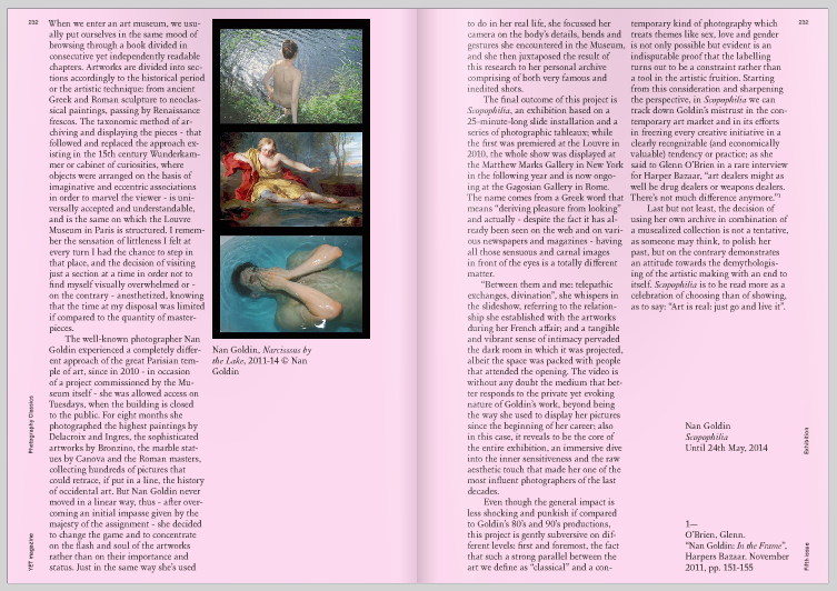 Even though the general impact is less shocking and punkish if compared to Goldin’s 80’s and 90’s productions, this project is gently subversive on different levels: first and foremost, the fact that such a strong parallel between the art we define as “classical” and a contemporary kind of photography which treats themes like sex, love and gender is not only possible but evident is an indisputable proof that the labelling turns out to be a constraint rather than a tool in the artistic fruition. Starting from this consideration and sharpening the perspective, in Scopophilia we can track down Goldin’s mistrust in the contemporary art market and in its efforts in freezing every creative initiative in a clearly recognizable (and economically valuable) tendency or practice; as she said to Glenn O’Brien in a rare interview for Harper Bazaar, “art dealers might as well be drug dealers or weapons dealers. There’s not much difference anymore.” (1)