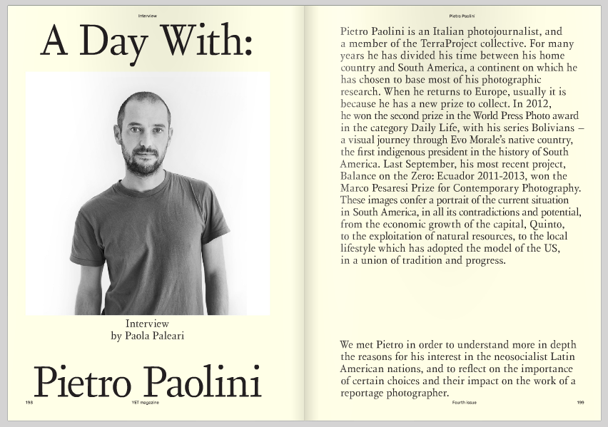 Pietro Paolini is an Italian photojournalist, and a member of the TerraProject collective. For many years he has divided his time between his home country and South America, a continent on which he has chosen to base most of his photographic research. When he returns to Europe, usually it is because he has a new prize to collect. In 2012, he won the second prize in the World Press Photo award in the category Daily Life, with his series Bolivians – a visual journey through Evo Morale’s native country, the first indigenous president in the history of South America. Last September, his most recent project, Balance on the Zero: Ecuador 2011-2013, won the Marco Pesaresi Prize for Contemporary Photography. These images confer a portrait of the current situation in South America, in all its contradictions and potential, from the economic growth of the capital, Quinto, to the exploitation of natural resources, to the local lifestyle which has adopted the model of the US, in a union of tradition and progress.