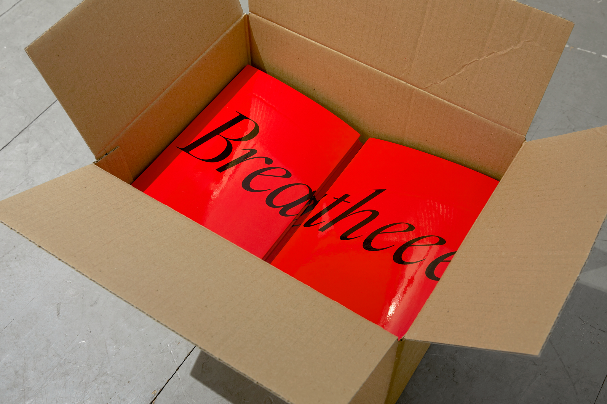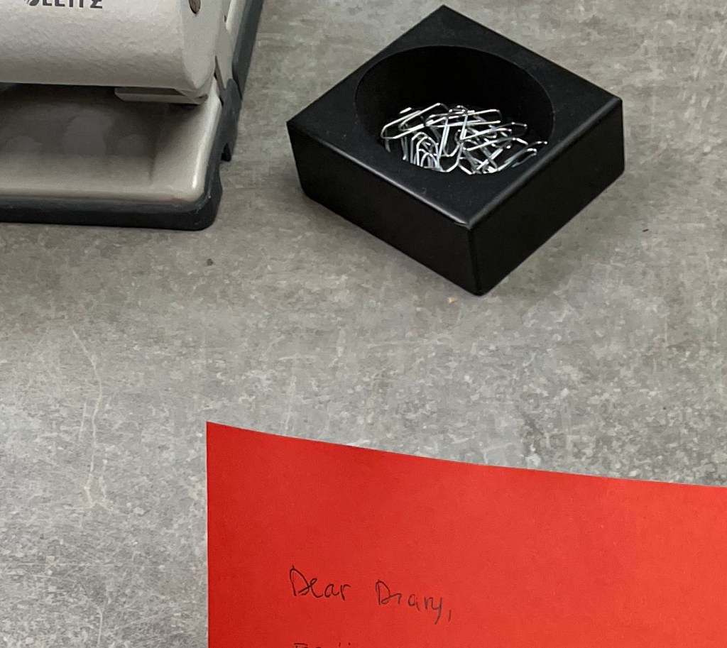 I hand-wrote my text in English on a piece of red paper. The text was subsequently translated into Danish and handwritten by Mads Juel.