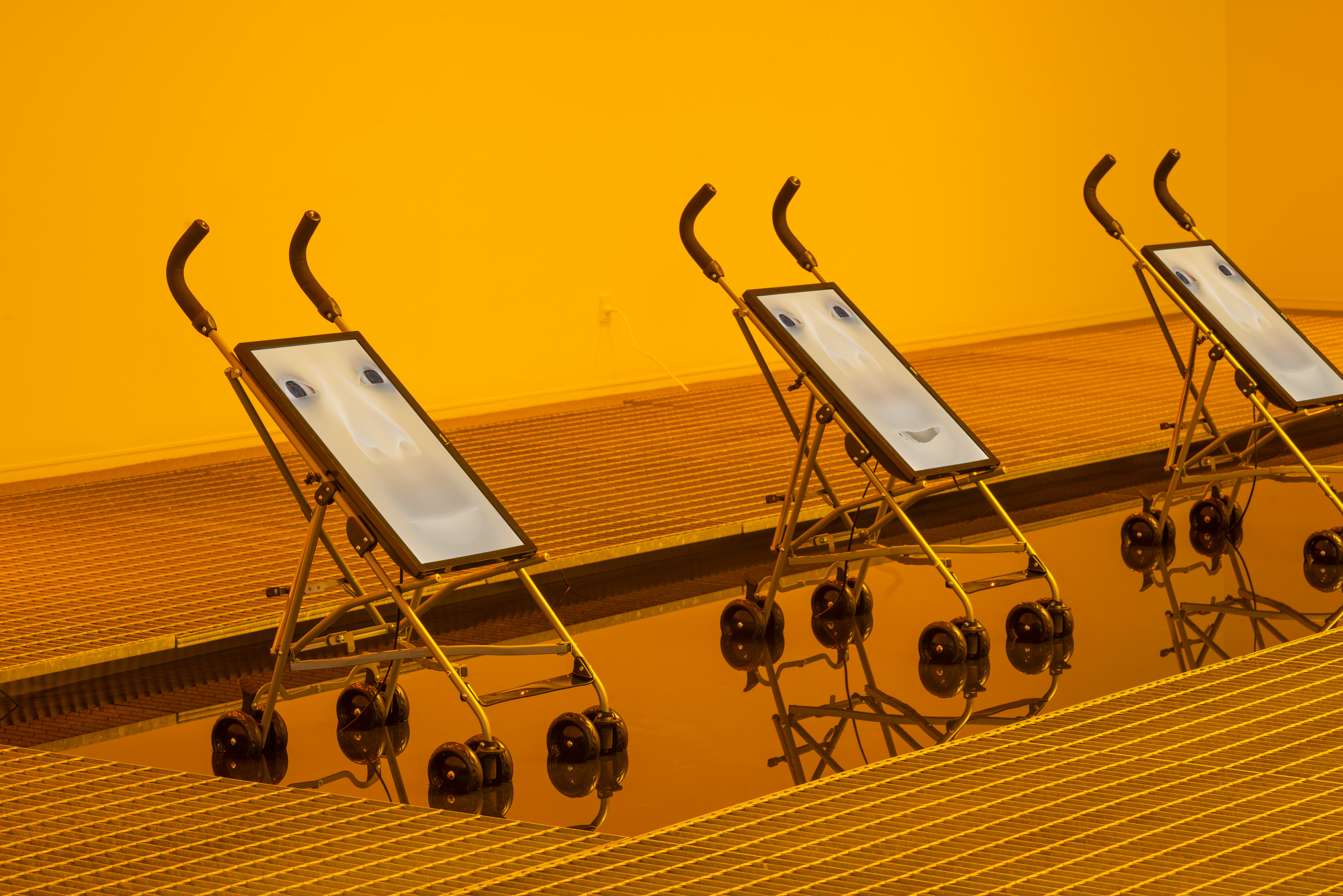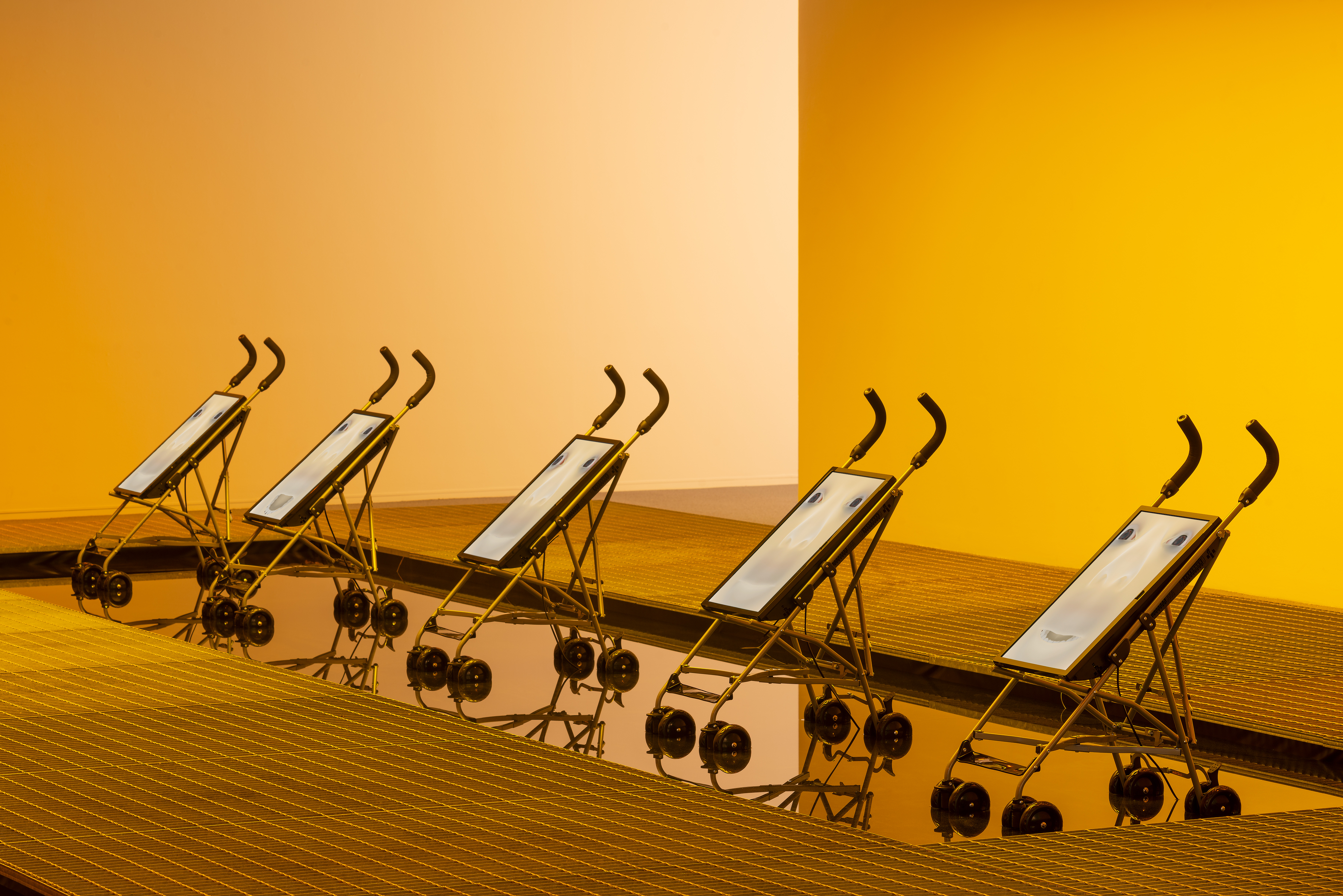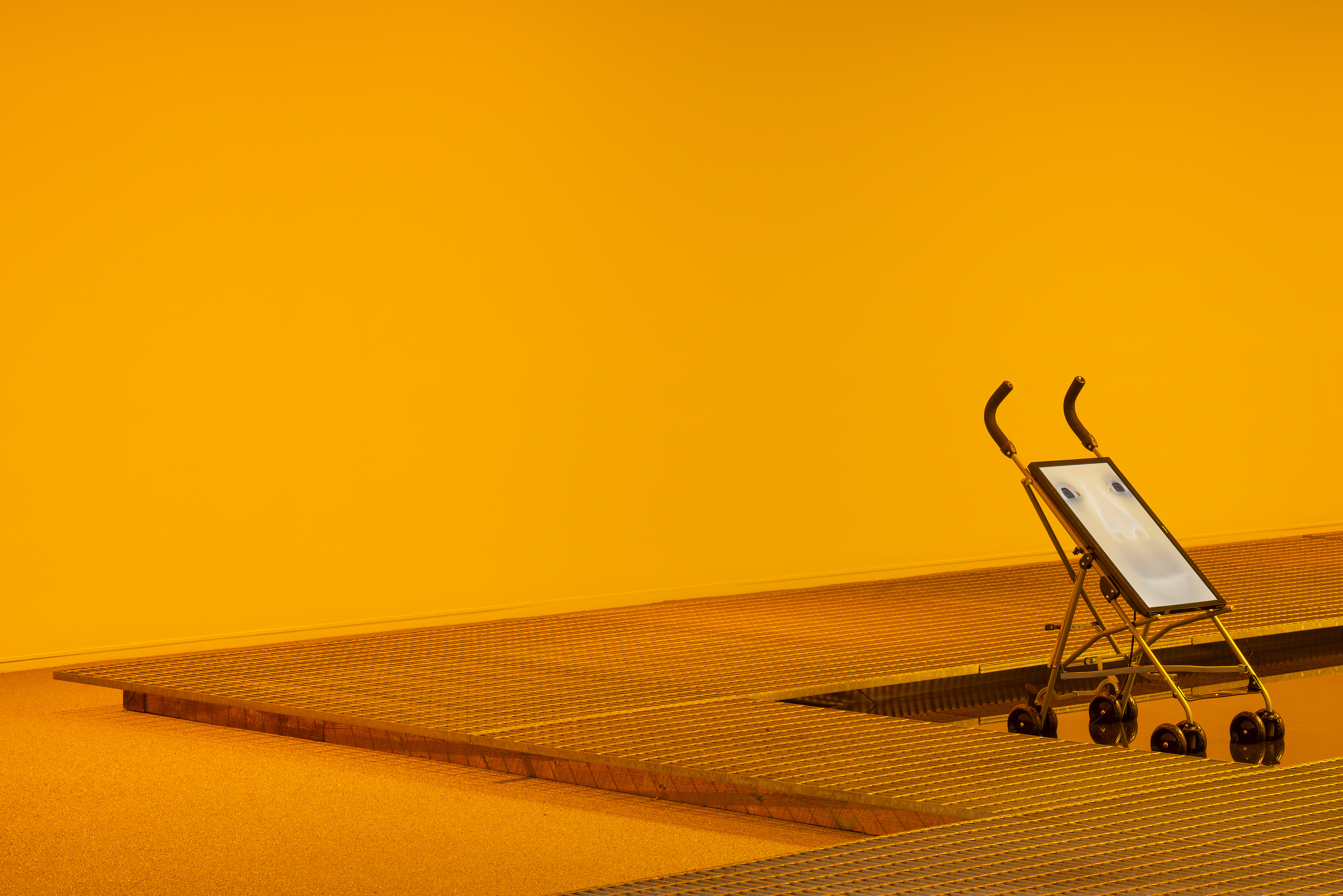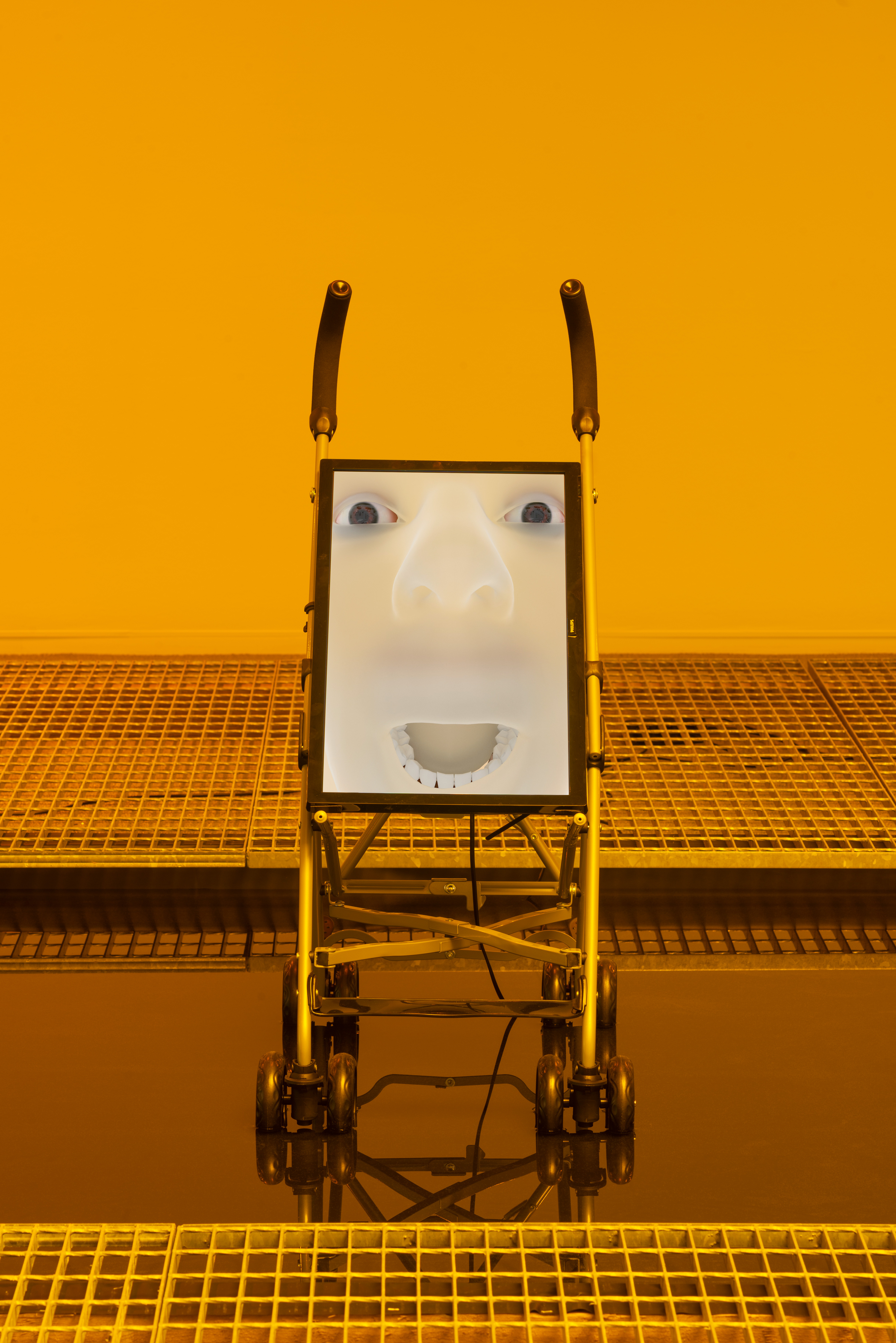 In between anthropomorphic creatures, intelligent machines and standardized everyday commodities, the sculptures are a hypothesis of a life configuration that still doesn’t exist, but builds upon codes embedded in our shared understanding of biological existence. For example, the baby stroller forming the base of the works represents infancy – a phase characterized by swift development – while the water in the pond hints at the amniotic fluid, where every new human life begins. Despite our many differences, water is what binds us together across countries, cultures and bodies; and, in this installation, maybe even across time, bringing us closer to an imaginable “tomorrow”.