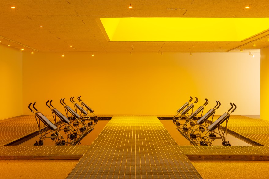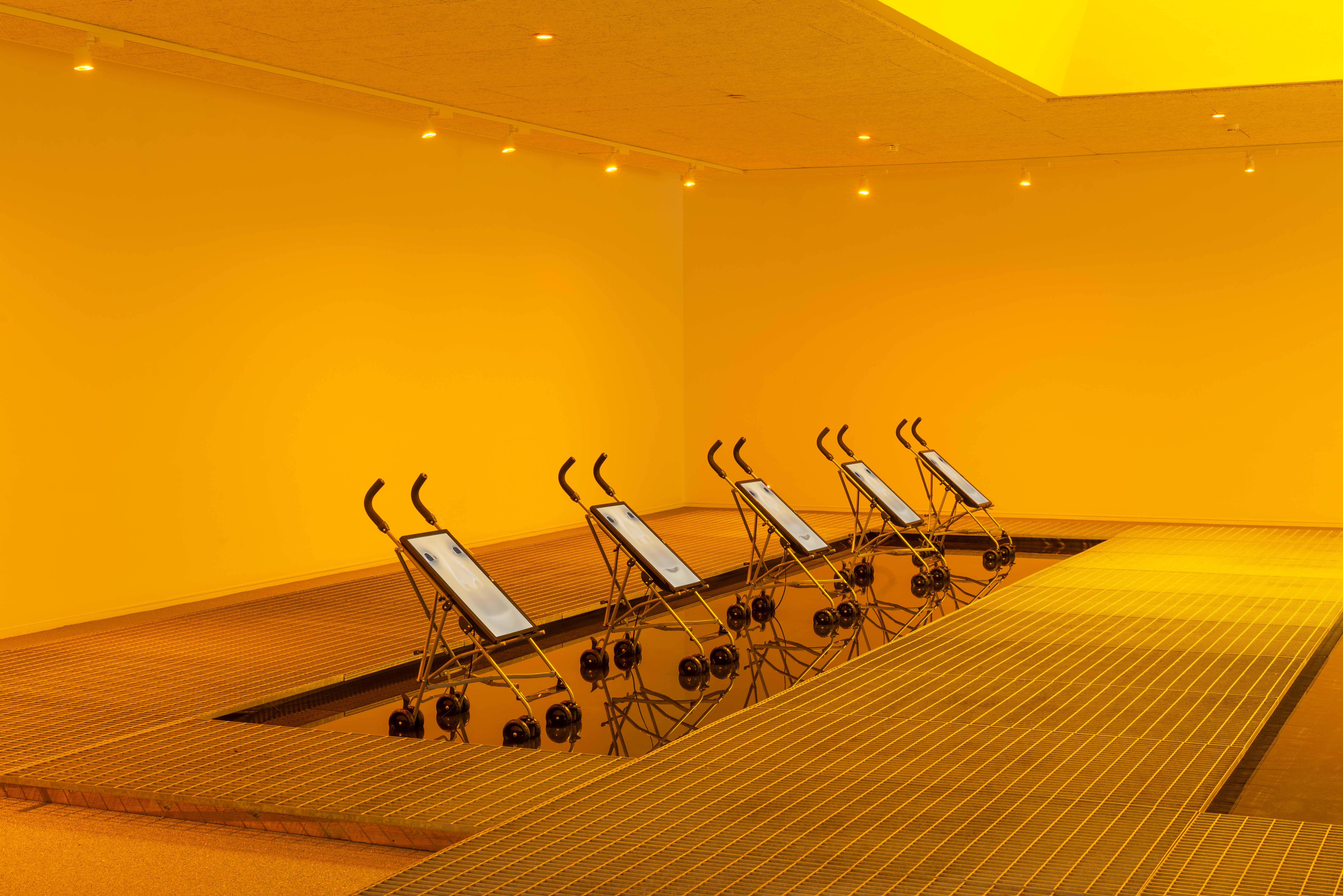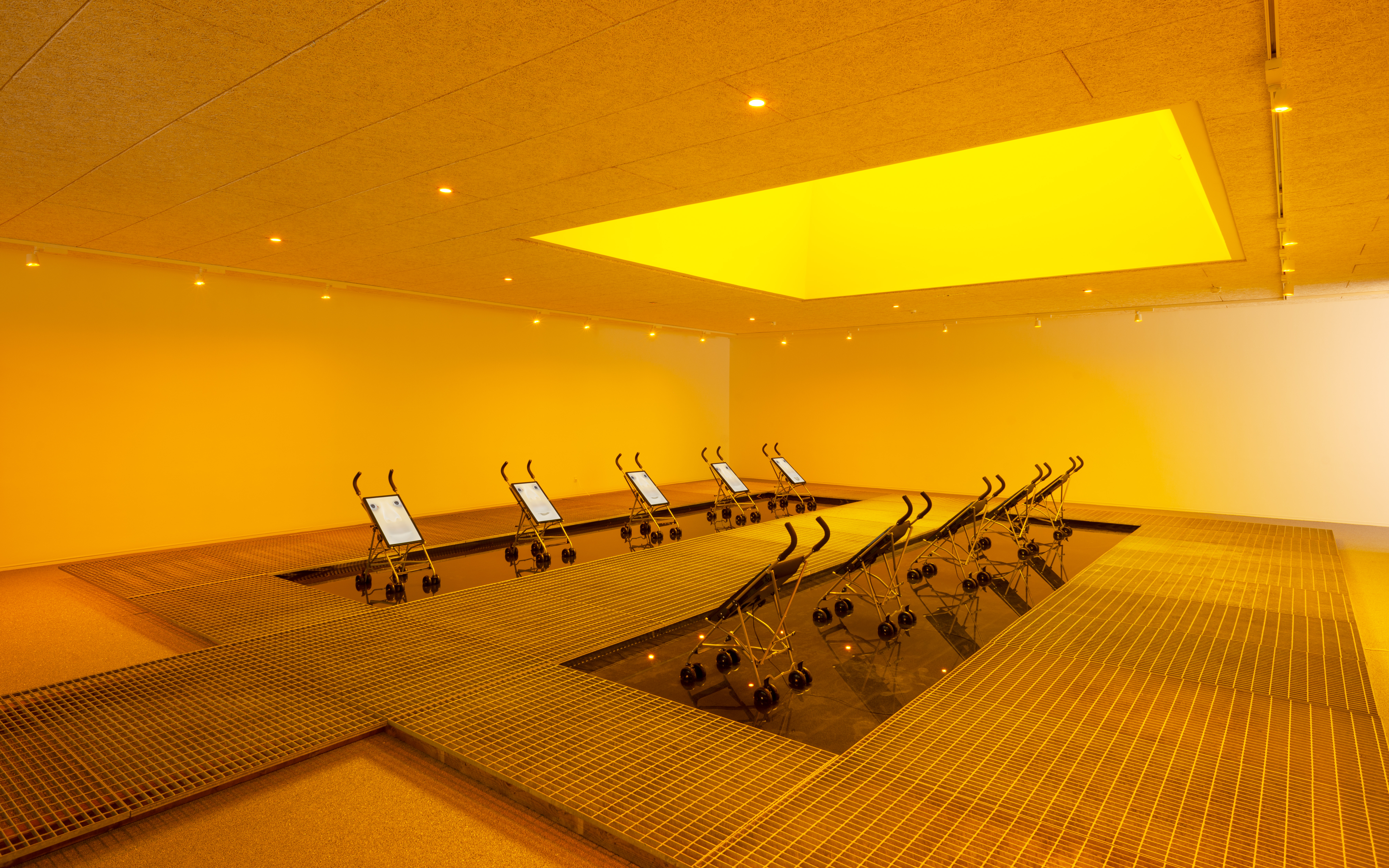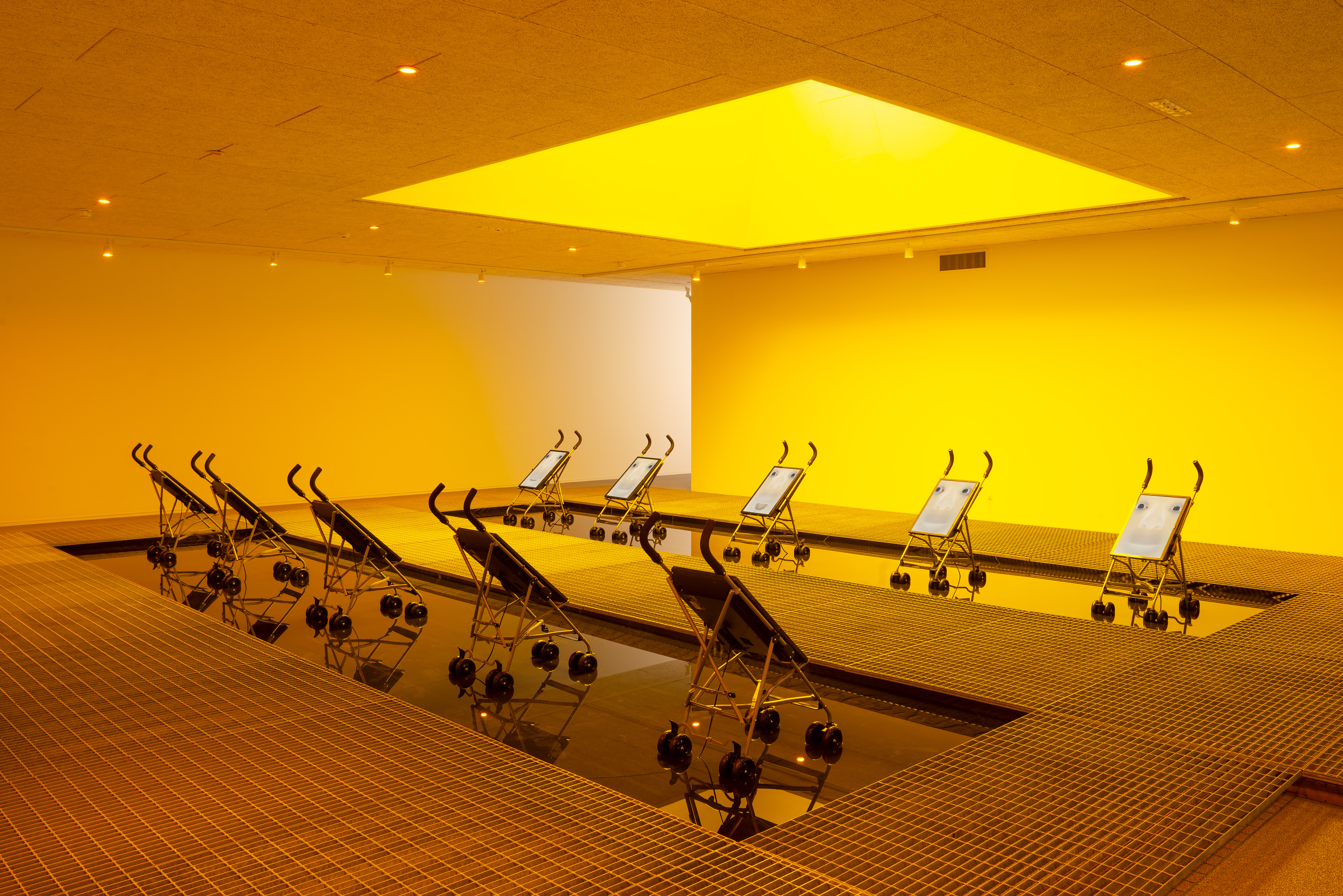 In between anthropomorphic creatures, intelligent machines and standardized everyday commodities, the sculptures are a hypothesis of a life configuration that still doesn’t exist, but builds upon codes embedded in our shared understanding of biological existence. For example, the baby stroller forming the base of the works represents infancy – a phase characterized by swift development – while the water in the pond hints at the amniotic fluid, where every new human life begins. Despite our many differences, water is what binds us together across countries, cultures and bodies; and, in this installation, maybe even across time, bringing us closer to an imaginable “tomorrow”.