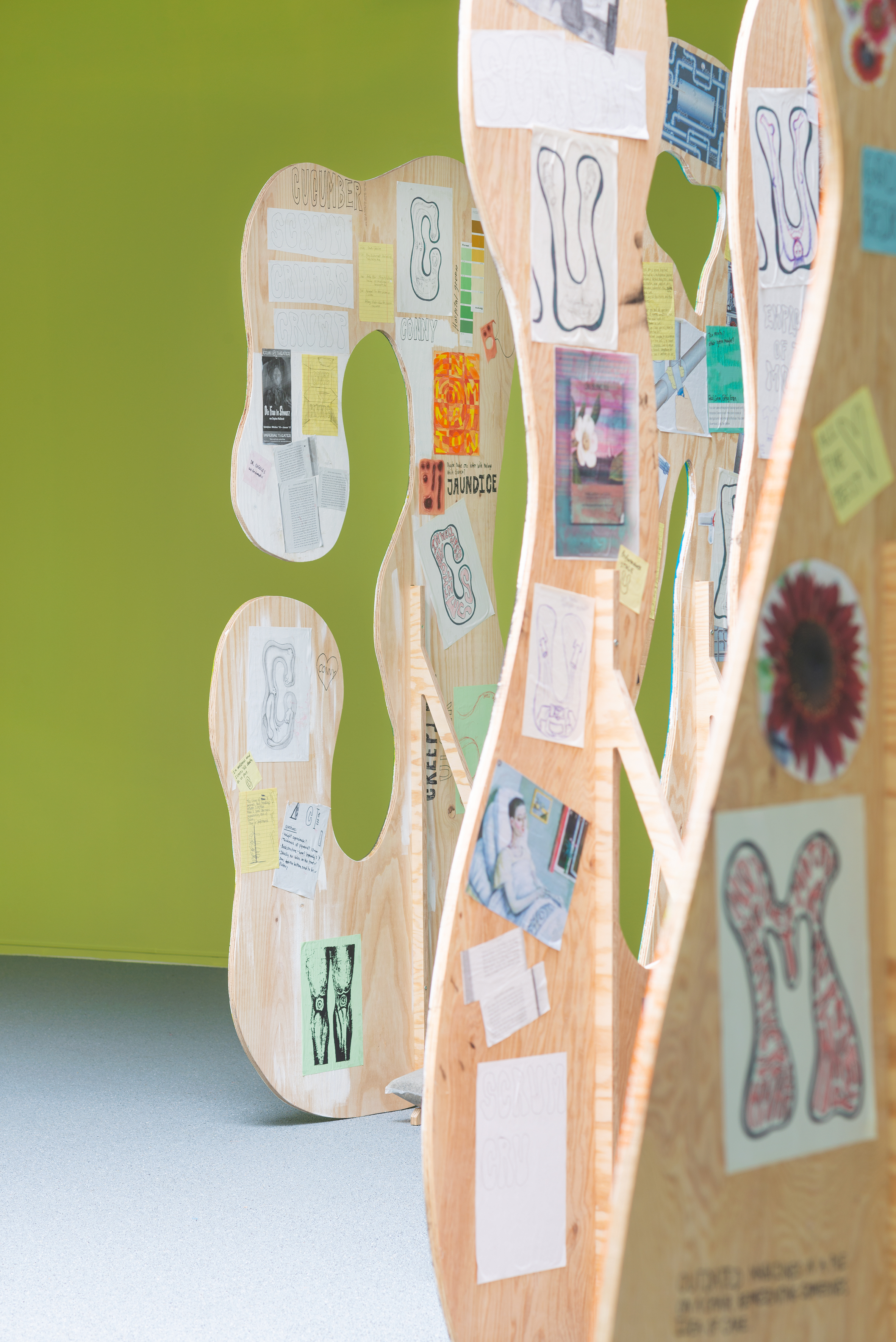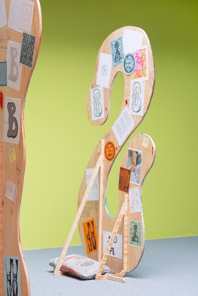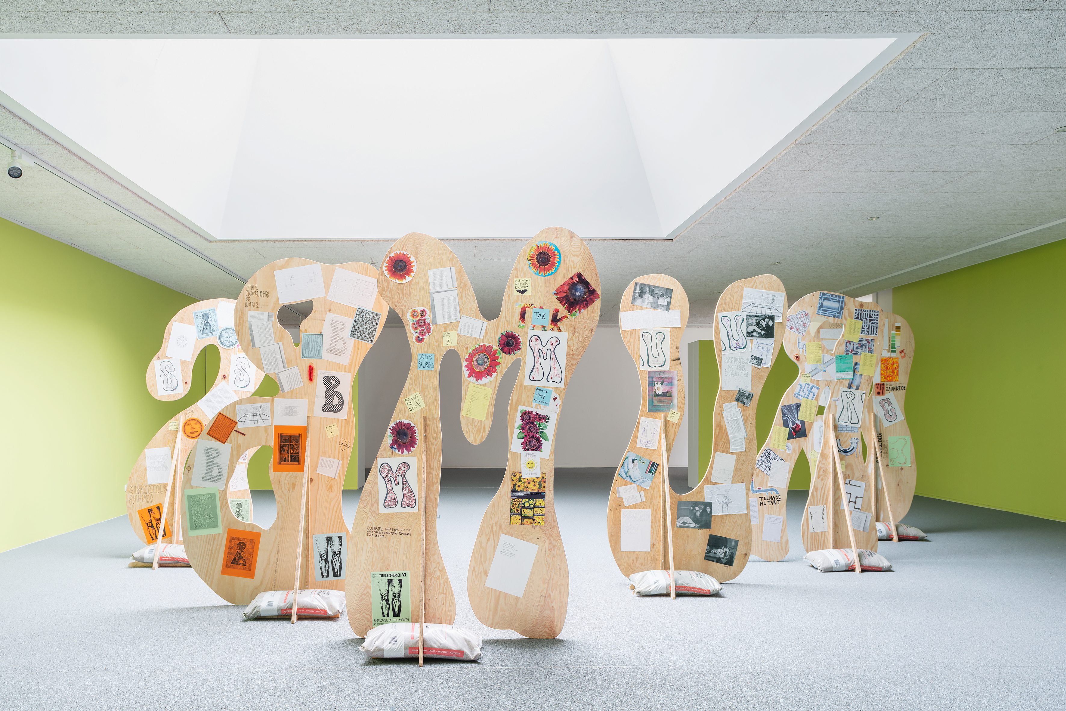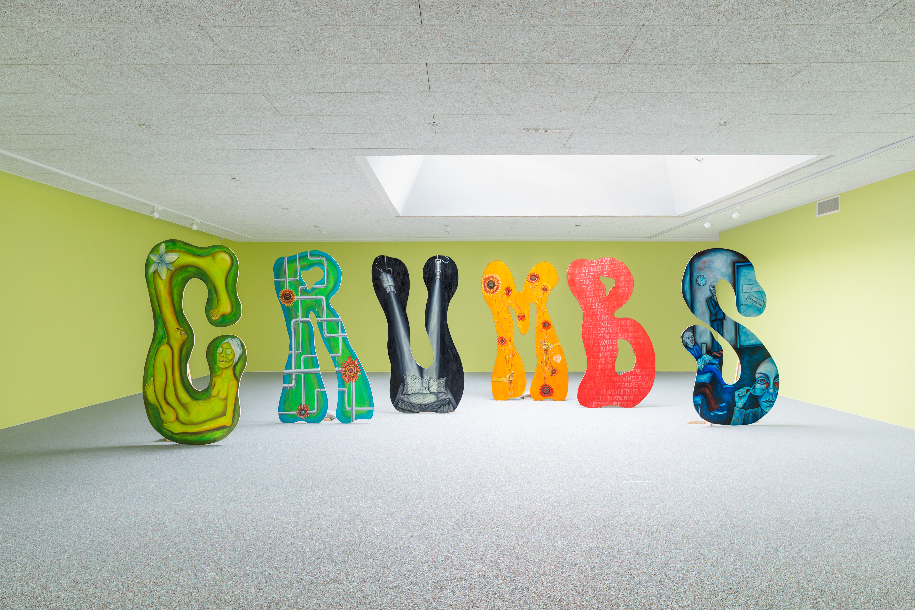 For the exhibition Employee of the Month, Tanja Nis-Hansen has created a site-specific body of work consisting of six large painted wooden elements, each forming a letter in the word “crumbs”.