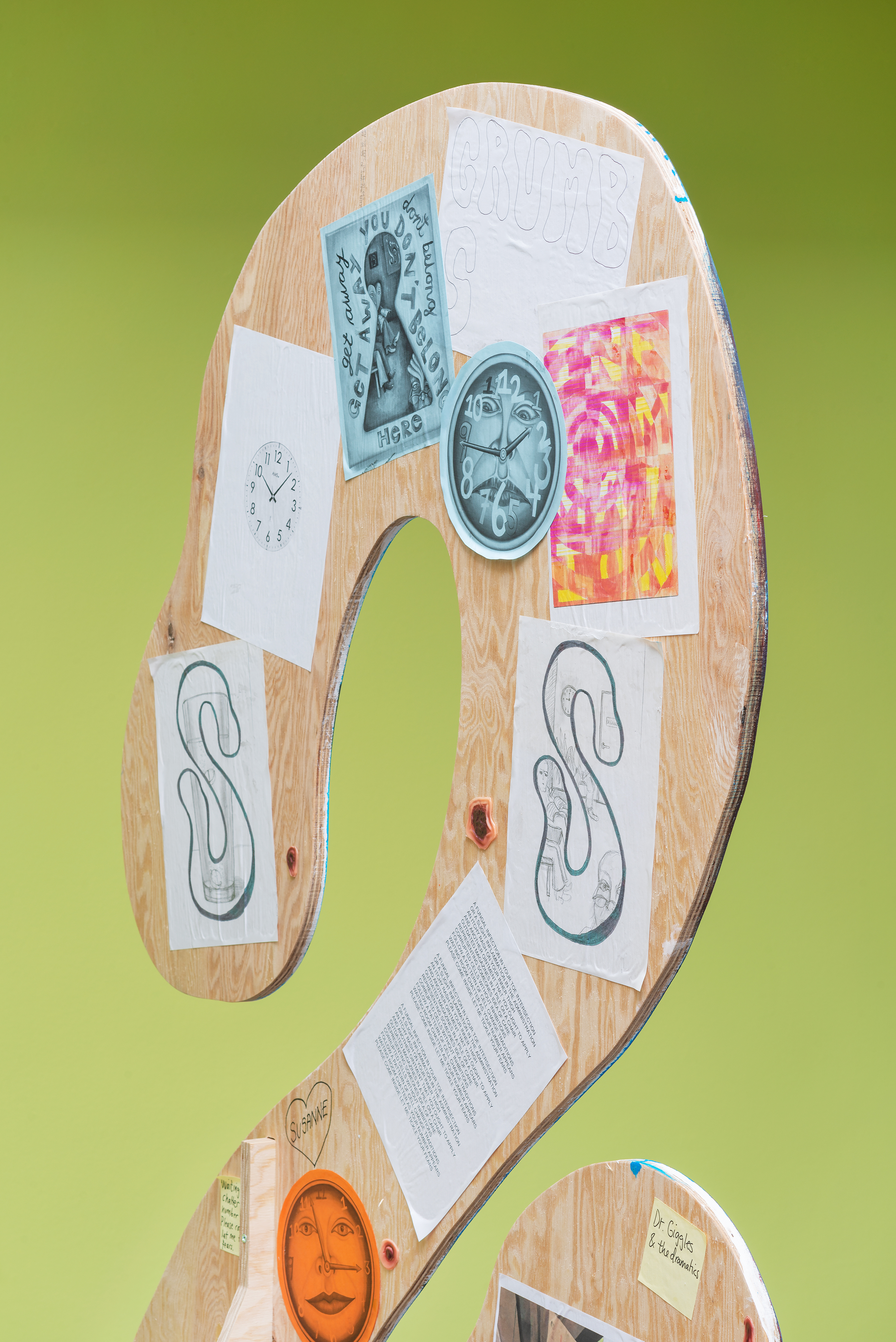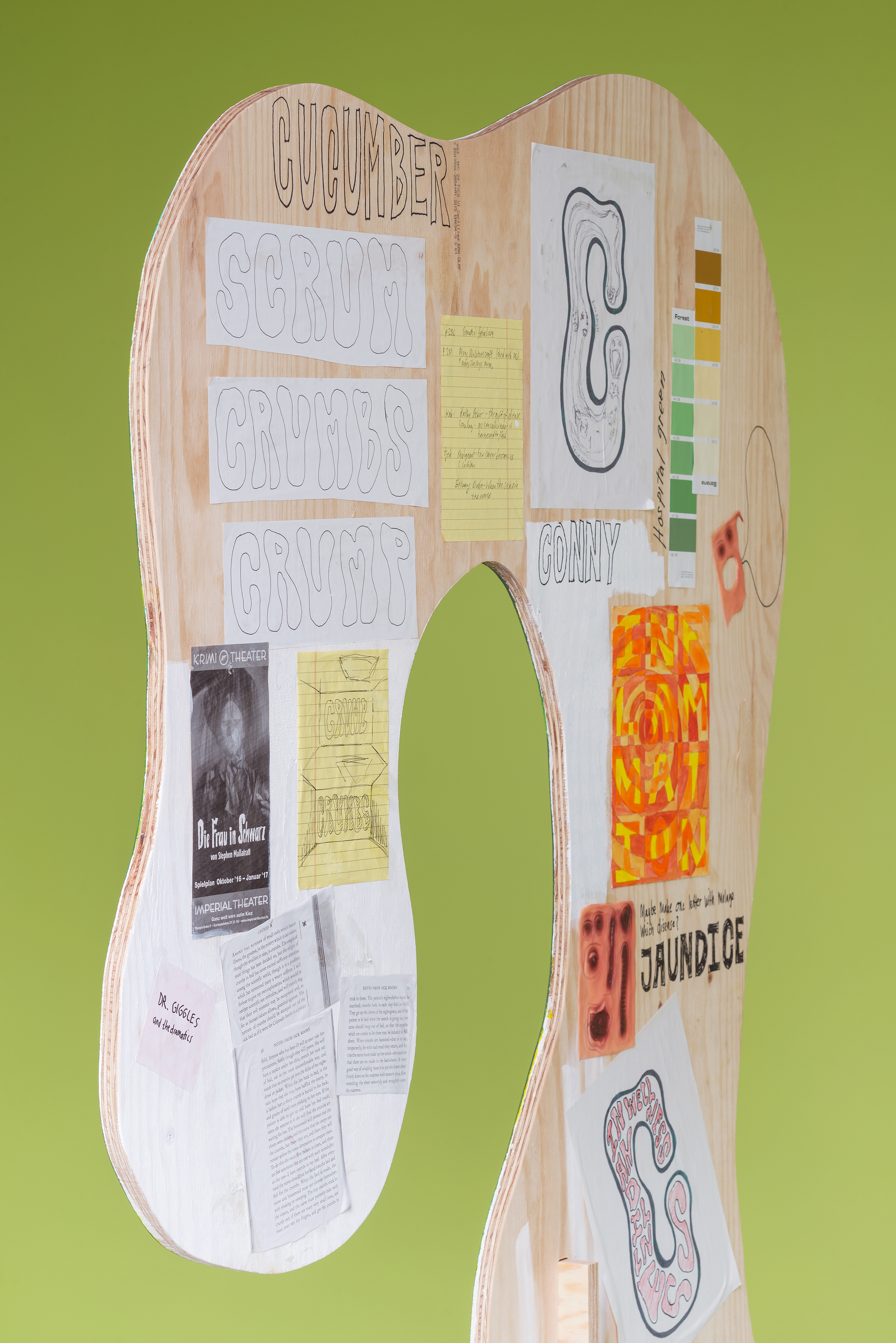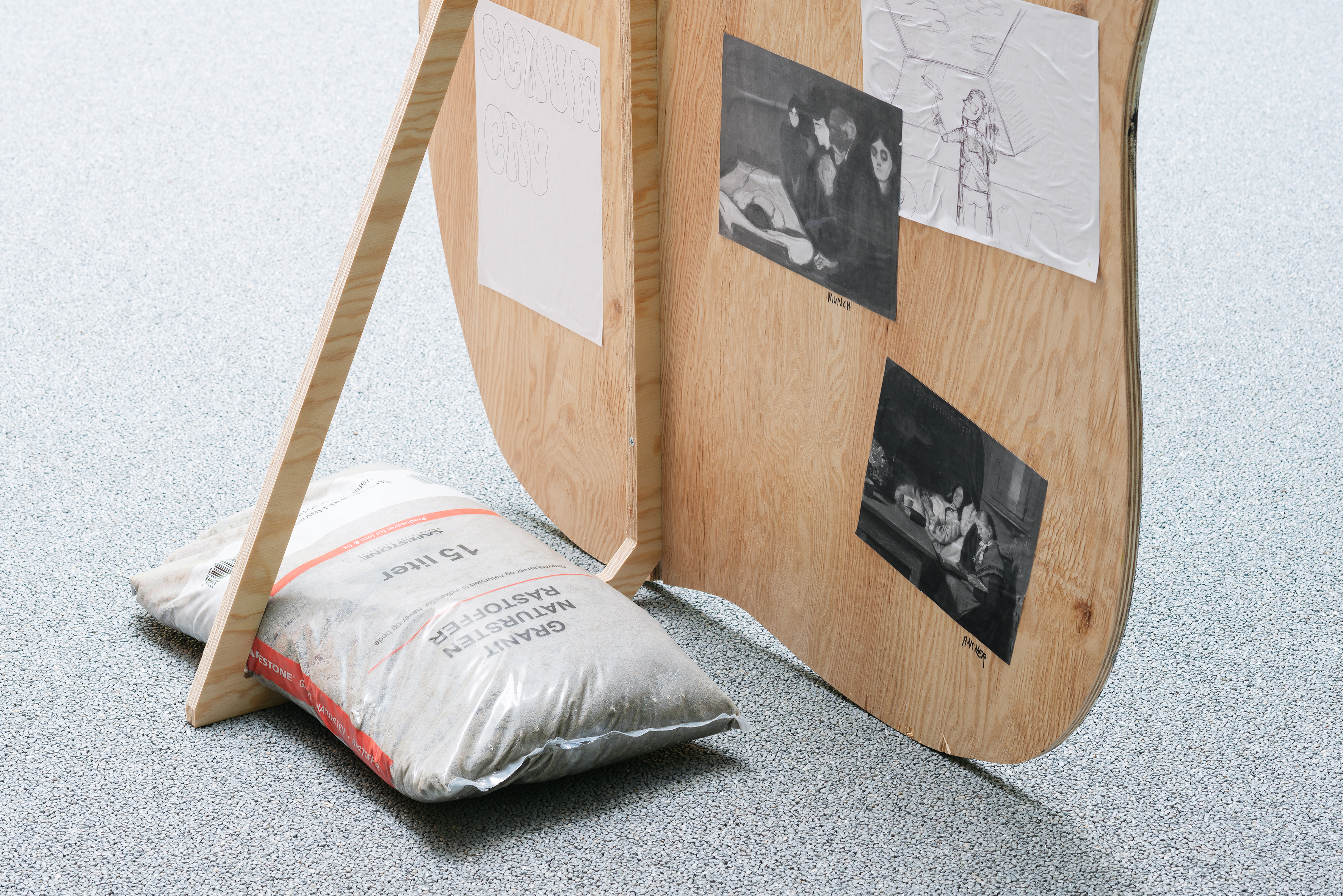 For the exhibition Employee of the Month, Tanja Nis-Hansen has created a site-specific body of work consisting of six large painted wooden elements, each forming a letter in the word “crumbs”.