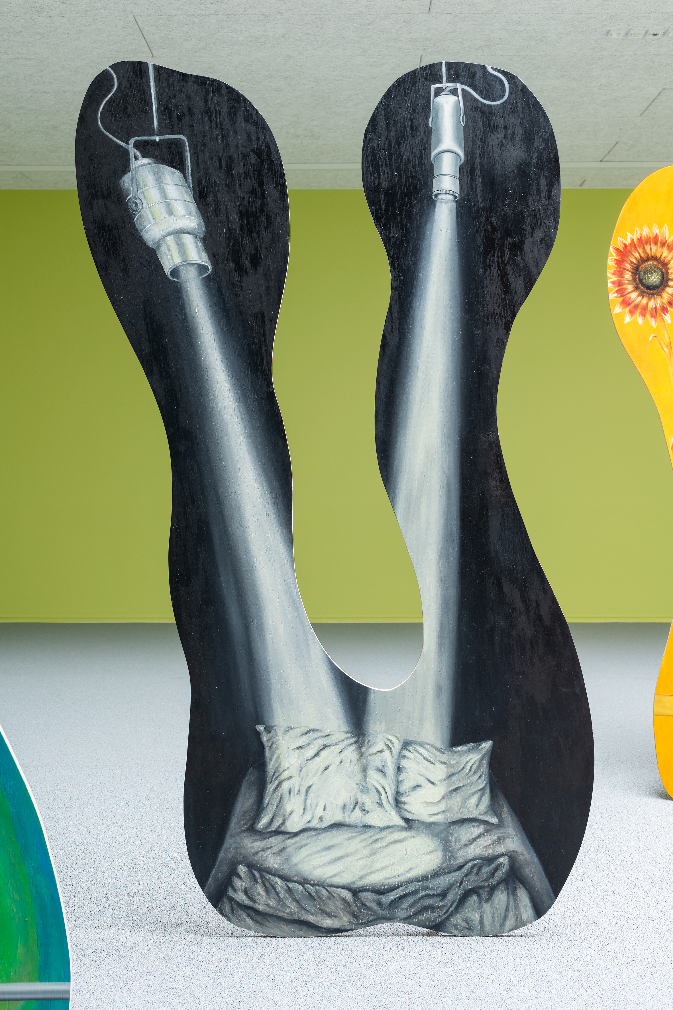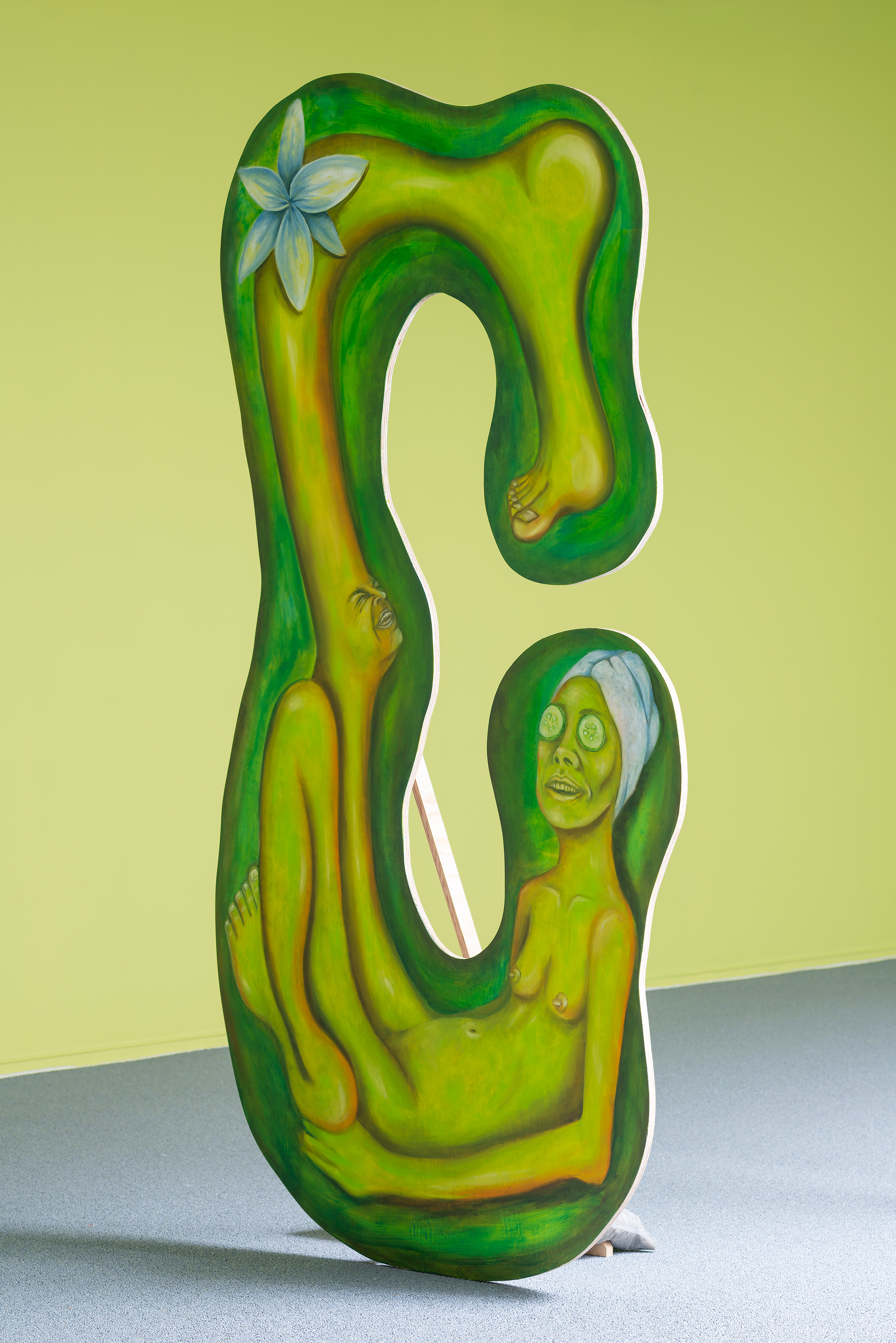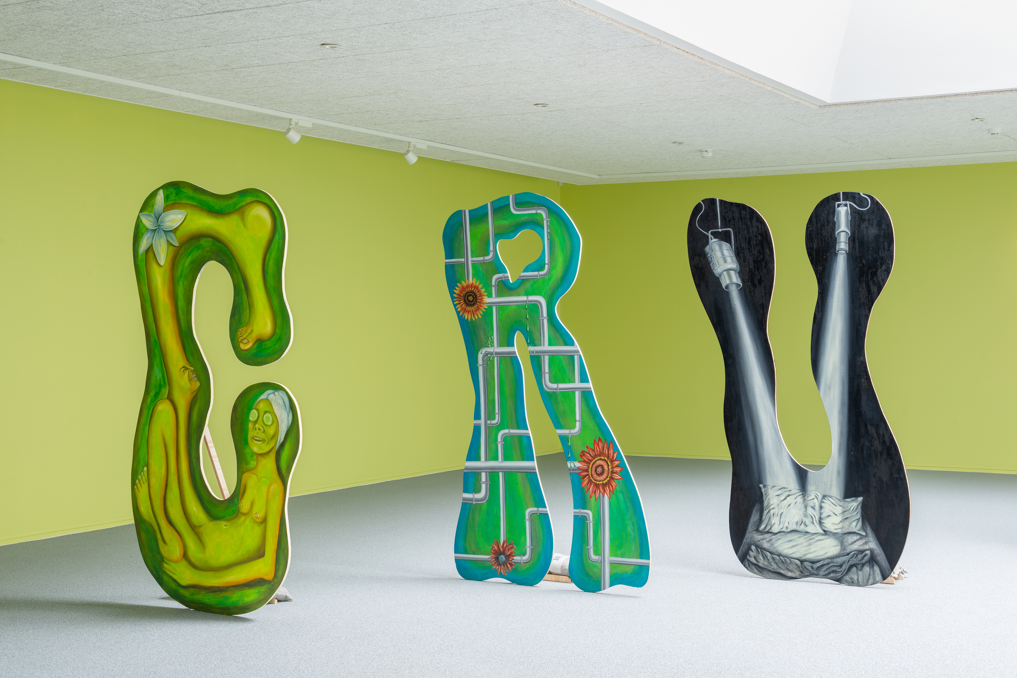 At the same time, the word in itself enigmatically acts as a textual ornament in the room. The scenographical arrangement of the panels taking the floor instead of hanging on the walls is both a statement against the normatives of art display and an invitation to look at painting released from its settled form as a commodity. Each panel is treated differently in regards to techniques and imagery, and still relying on the classic understanding of how a “proper painting” should be executed. Yet, its very shape seems to mock the rigidity of the traditional canvas.