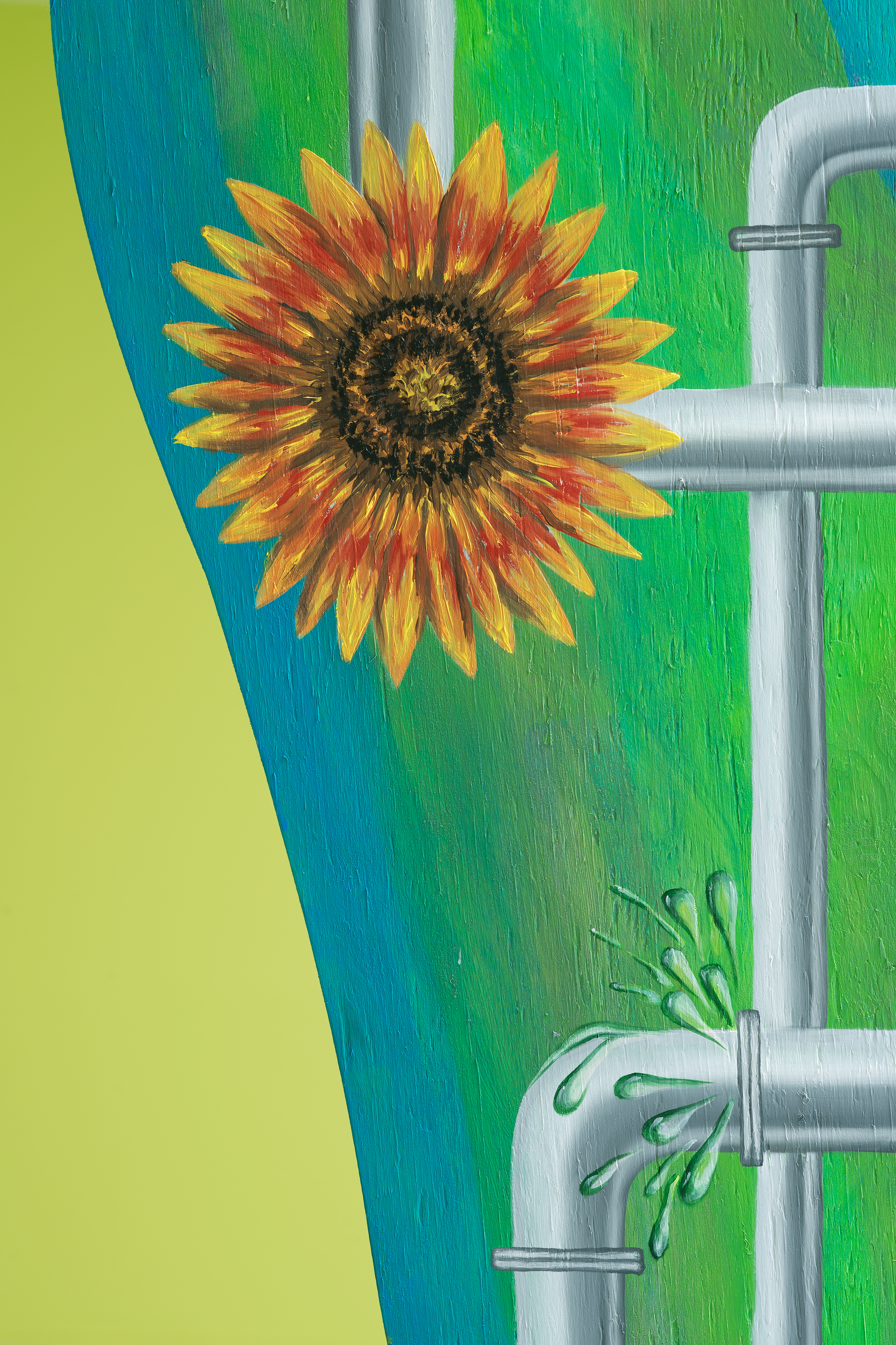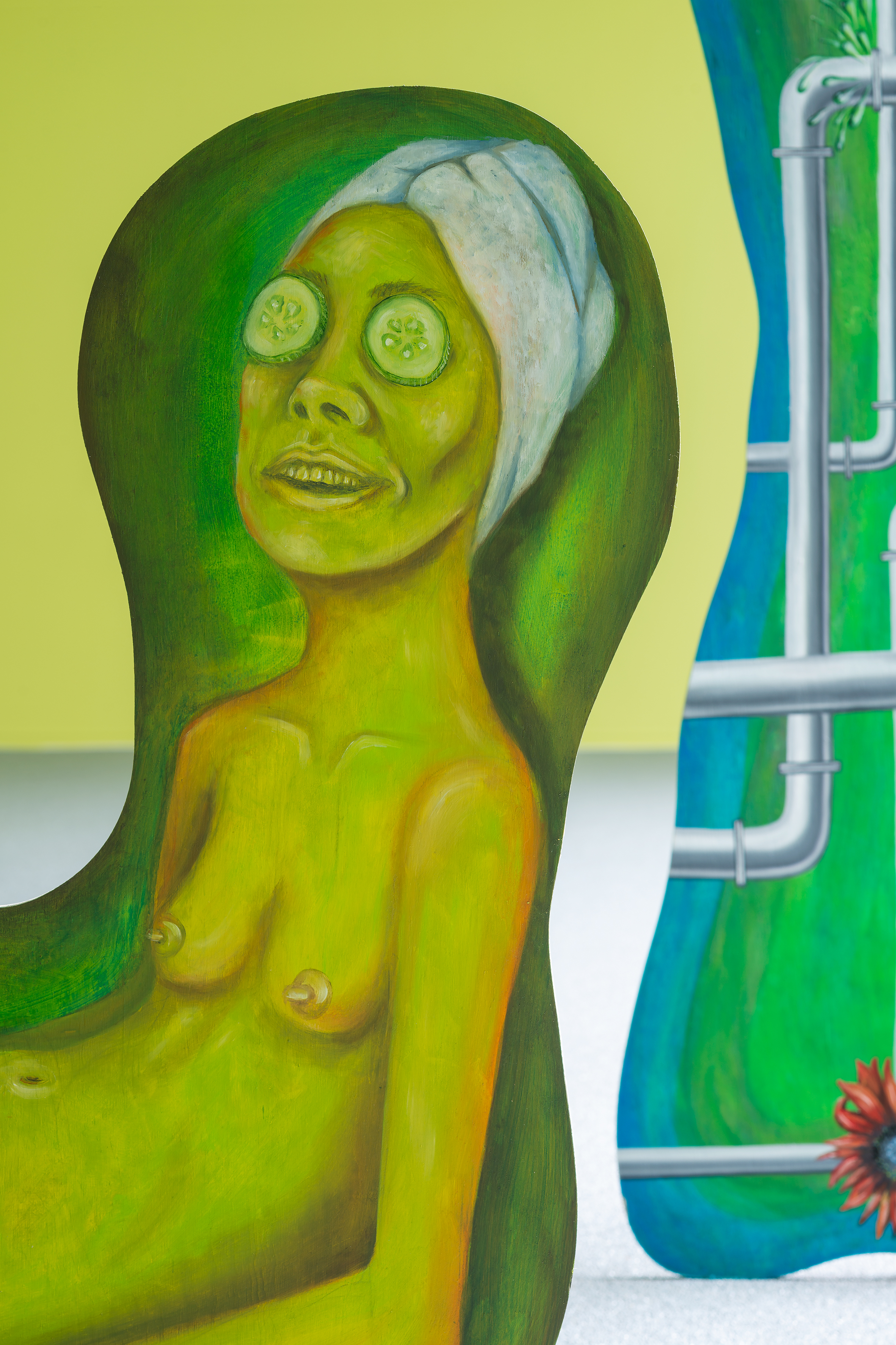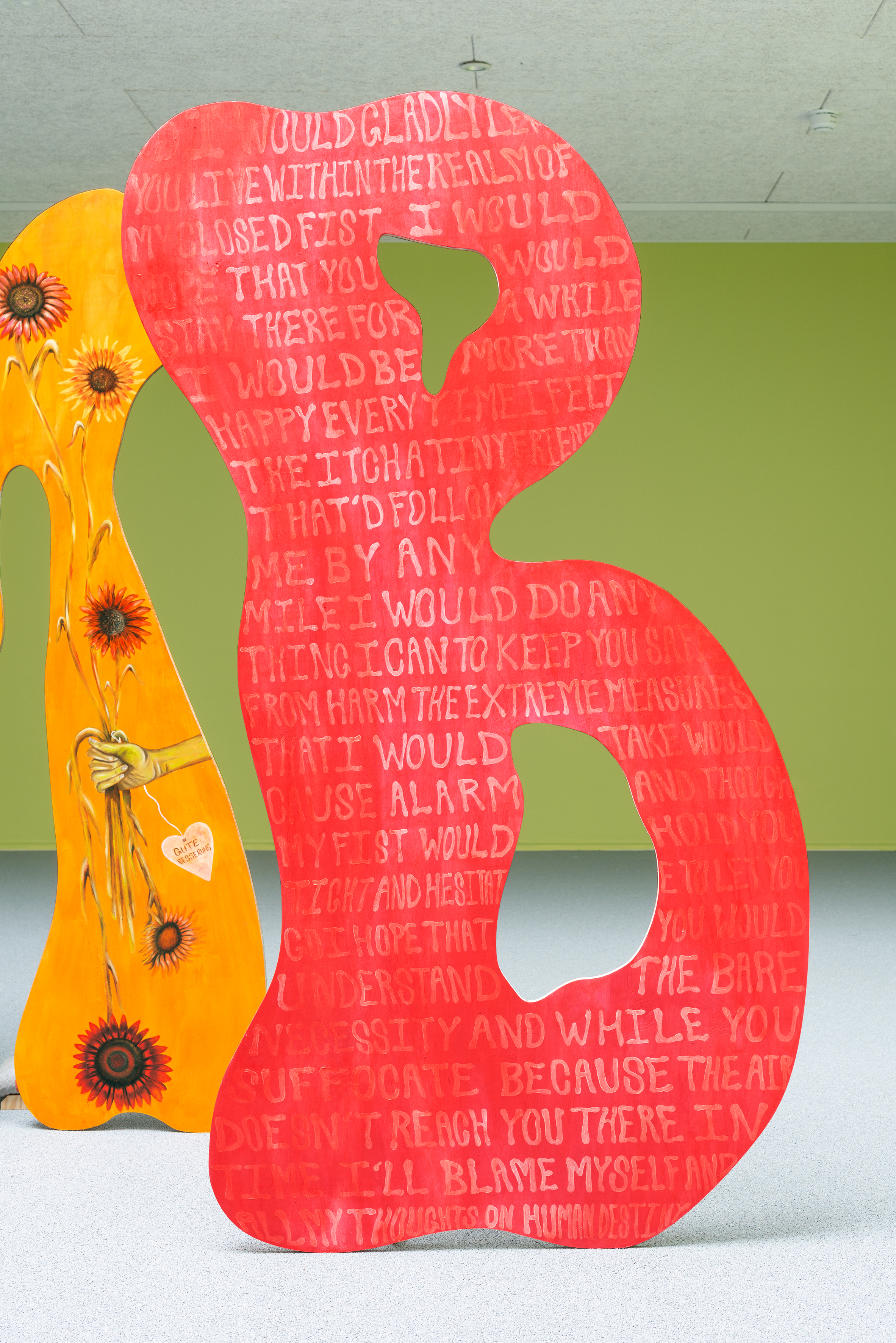 At the same time, the word in itself enigmatically acts as a textual ornament in the room. The scenographical arrangement of the panels taking the floor instead of hanging on the walls is both a statement against the normatives of art display and an invitation to look at painting released from its settled form as a commodity. Each panel is treated differently in regards to techniques and imagery, and still relying on the classic understanding of how a “proper painting” should be executed. Yet, its very shape seems to mock the rigidity of the traditional canvas.